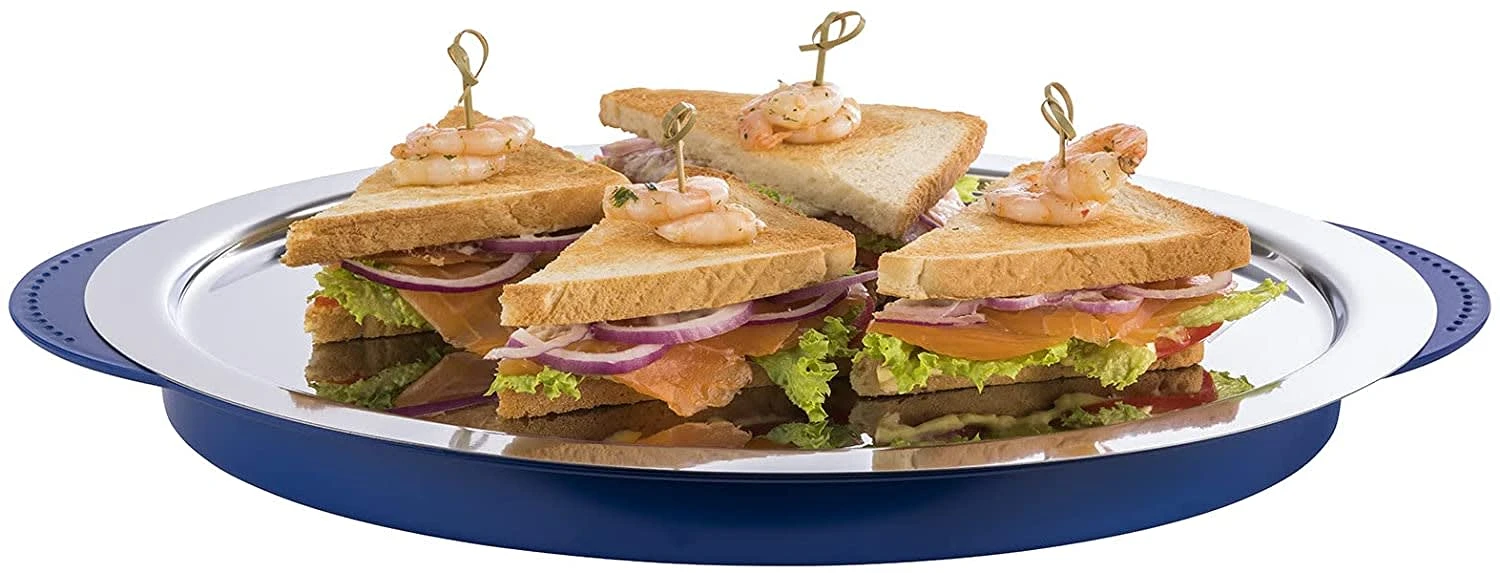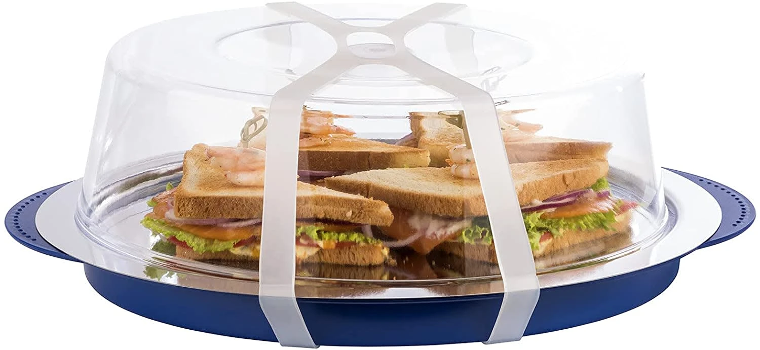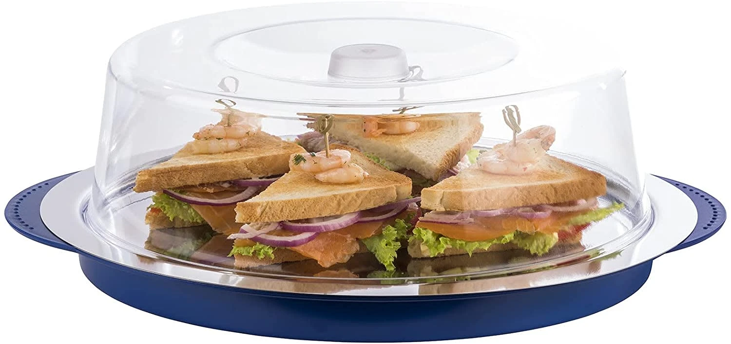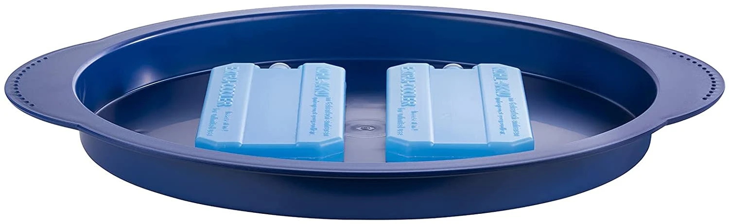 Die blaue Kühlakku-Schale hat zwei Griffe, das flache, darüber liegende Edelstahl Tablett hat einen breiten Rand und die transparente Kunststoff-Haube lässt sich in der Mitte durch einen eingearbeiteten Griff ganz leicht abnehmen, was eine unkomplizierte Handhabung ermöglicht. Die beiden Kühlakkus, in der Kühlschale sorgen dafür, dass die Speisen bis zu 6 Stunden gekühlt bleiben.