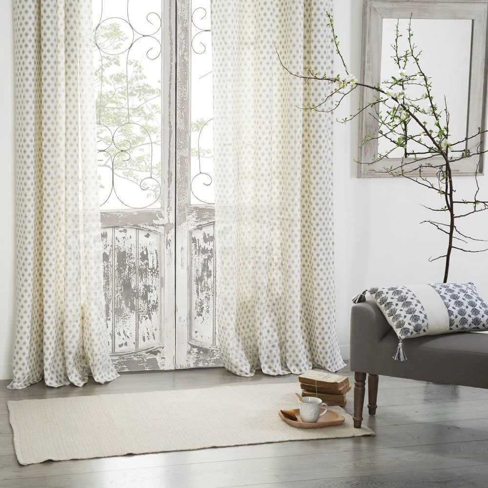 Der Vorhang ist ein Element der Raumausstattung, das uns das Gefühl von Sicherheit, mehr Komfort und Privatsphäre vermittelt. Es wird uns vor den Blicken der Passanten, den scharfen Sonnenstrahlen oder dem Licht eines Leuchtturms schützen. Der Vorhang ist in einer zarten ecru-Farbe mit einem grauen geometrischen Motiv gehalten, was ihm ein originelles Aussehen verleiht und den Raum zu einer freundlichen Atmosphäre macht. Im Schlafzimmer, Wohn- oder Kinderzimmer schafft es eine Atmosphäre von Leichtigkeit und Transparenz. Der Vorhang ist mit 8 Metallgittern mit einem Durchmesser von 4 cm ausgestattet, die das Aufhängen und Abnehmen an der Gardinenstange erleichtern und das Gewebe zusätzlich in weichen Wellen anordnen. Der Vorhang wurde von der französischen Firma Atmosphera Créateur d’intérieu entworfen und hergestellt, die sich auf die Herstellung von Dekorationen und Heimtextilien auf höchstem Niveau spezialisiert hat und deren Produkte gemäß den Welttrends ständig beliebt sind.