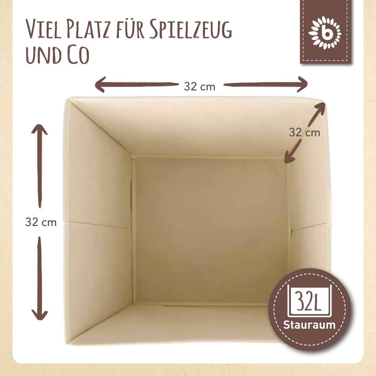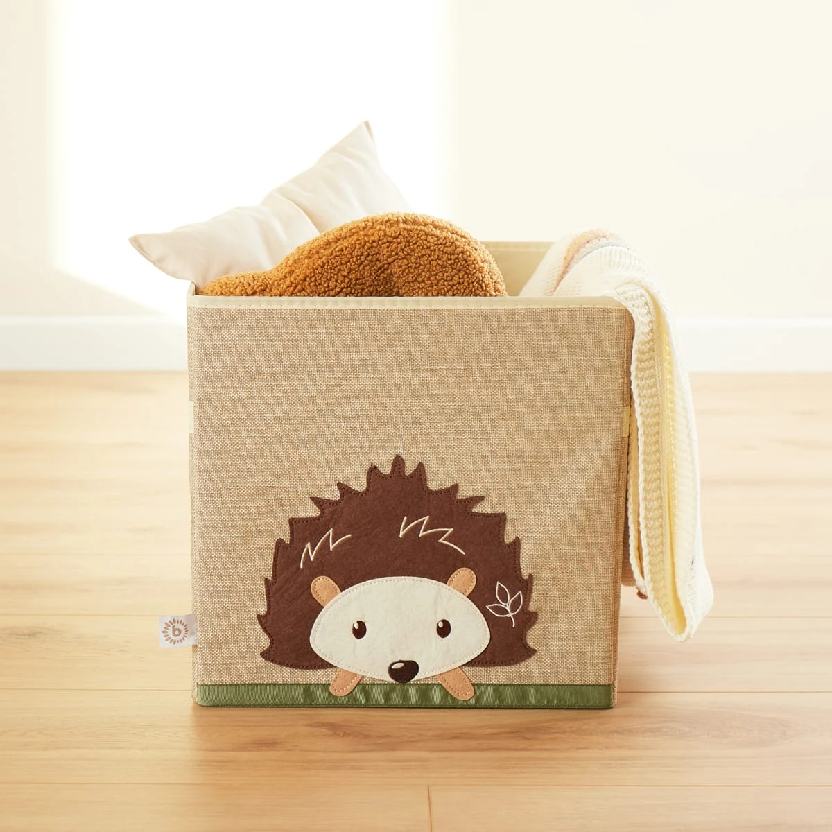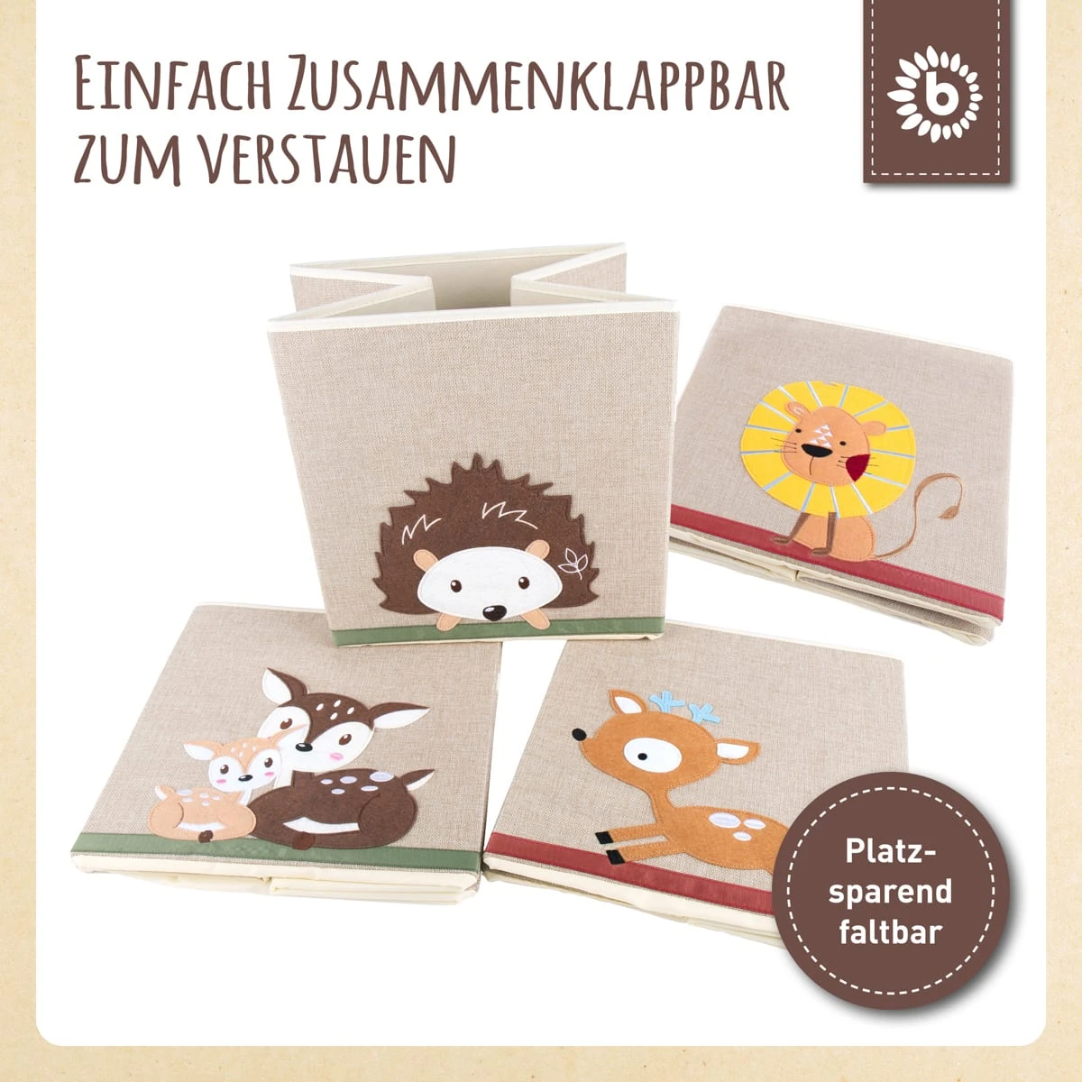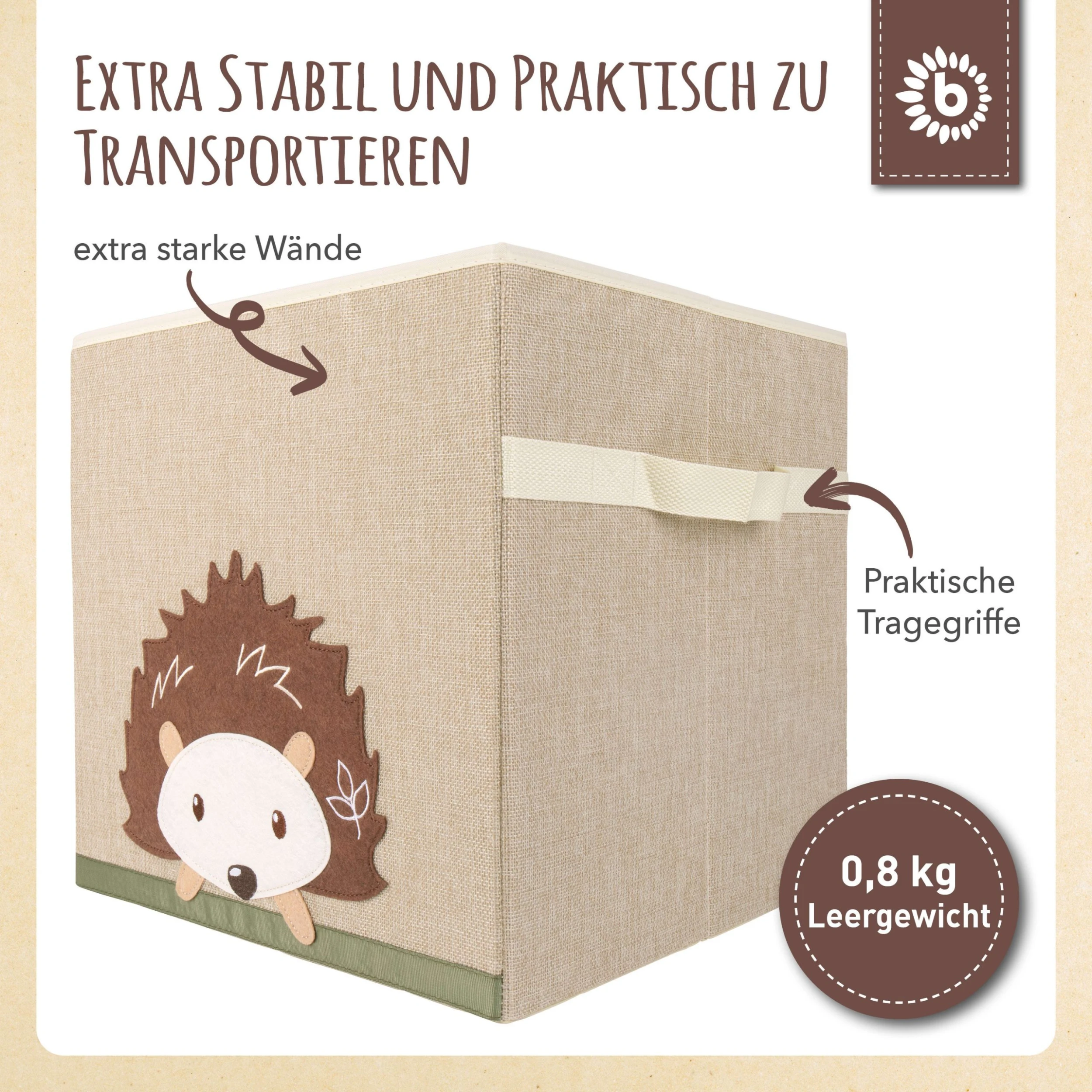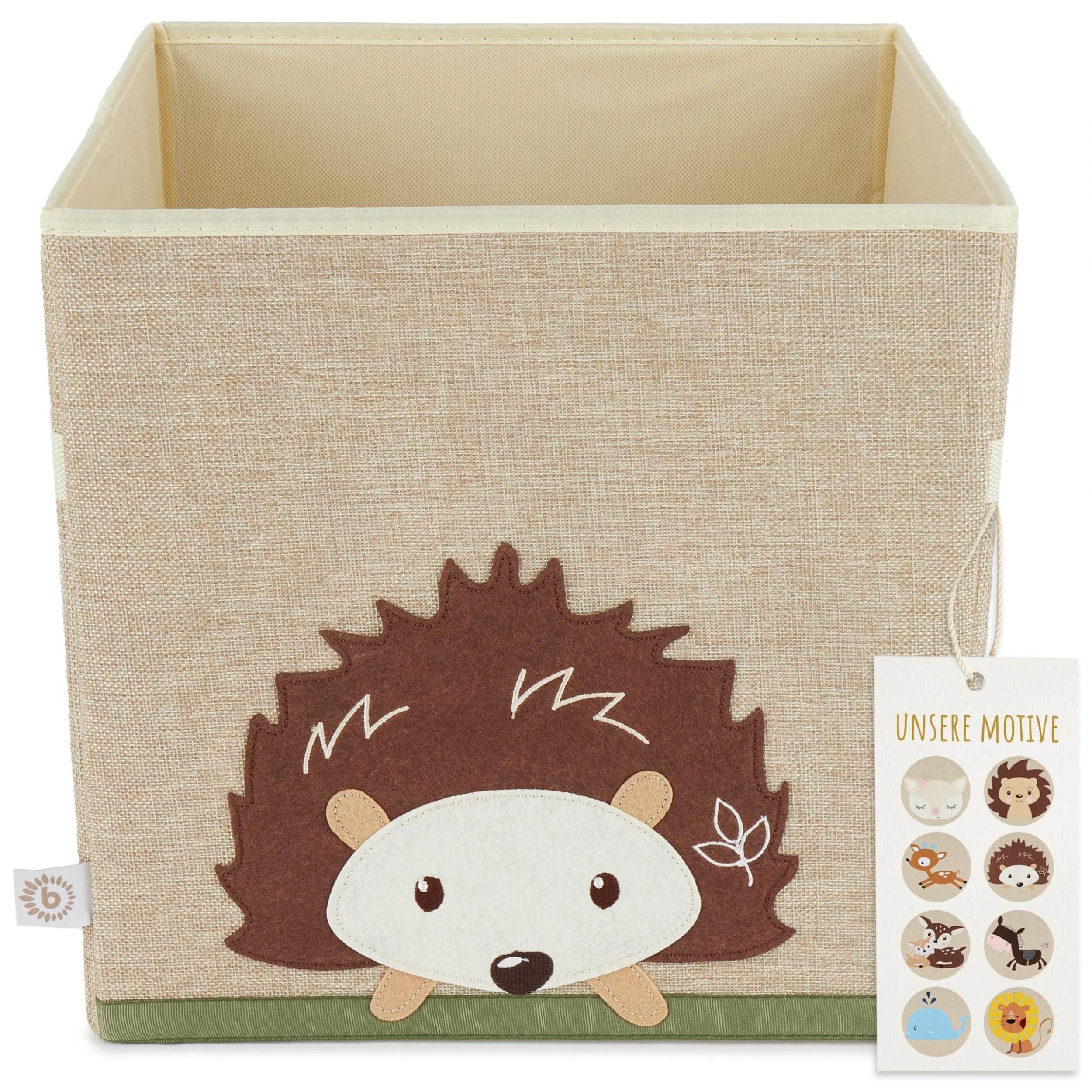 Diese schöne Kinder Aufbewahrungsbox von Bieco bringt Ordnung ins Kinderzimmer. Im niedlichen Igelmotiv verschönert die Aufbewahrungsbox Kinderzimmer und bereitet Kindern und Eltern viel Freude. Die Dekorative Kiste ist quadratisch und lässt sich problemlos als Kallax Box verwenden. Wird die Aufbewahrungsbox einmal nicht benötigt, kann sie einfach zusammengefaltet werden und verschwindet platzsparend im Schrank. Dank der Tragegriffe an der Seite der Baby Box lässt sie sich spielend einfach transportieren. Etwa 33x33x33 cm ist die Aufbewahrungsbox klein und hat ein Fassungsvermögen von etwa 36 Liter. Der Aufbewahrungskorb Kinder ist durch seine Oberfläche aus Polyester besonders pflegeleicht und robust. Entdecke auch unsere weiteren Aufbewahrungsboxen mit Deckel für das Kinderzimmer in passenden Designs. Die Marke BIECO steht seit vielen Jahren für höchste Qualität und innovative Produktentwicklung. Unsere Spielwaren für Babys und Kleinkinder unterliegen allesamt den strengsten Richtlinien deutscher Produkt- und Sicherheitsstandards. BIECO möchte Kindergesichter zum Strahlen bringen, deshalb werden alle Designs für unsere Kleinen mit Liebe gefertigt.