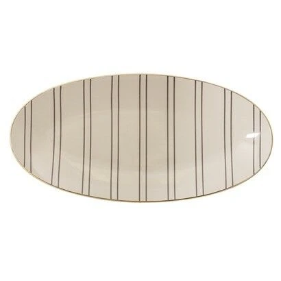 Bloomingville Ava Serving Plate. Beige farbige ovale Servierplatte mit grauen Streifen und feinem Goldrand aus der Ava Geschirr Kollektion von Bloomingville. Größe ca. 21 x 43 cm.