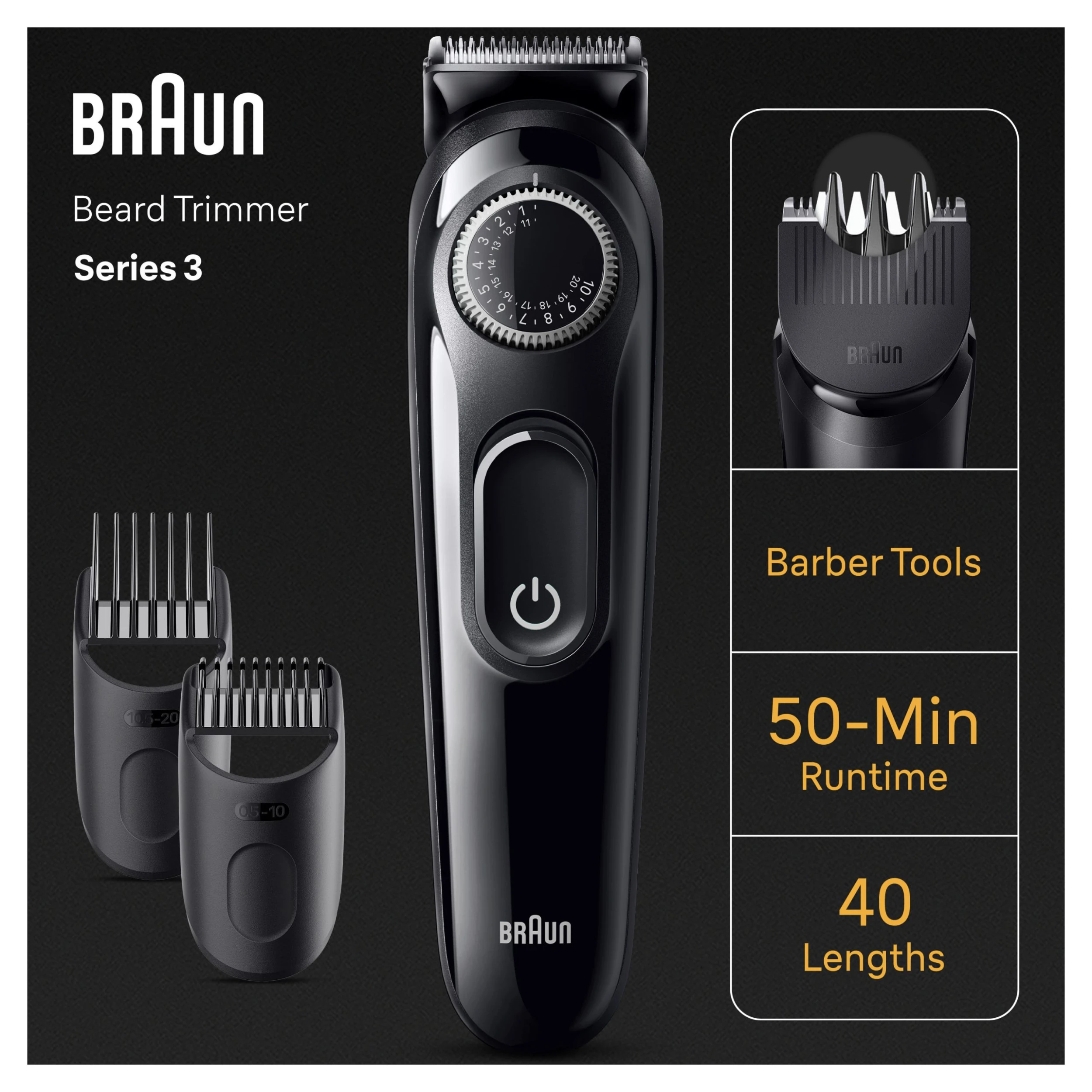 Für einen Barber Fresh Look zu Hause – Braun Series 3 Barttrimmer. Präzise bei jedem Zug mit ultrascharfen Klingen – für ein gleichmäßiges Trimmen aller Bärte. Präzisionsrad mit 40 Längeneinstellungen.