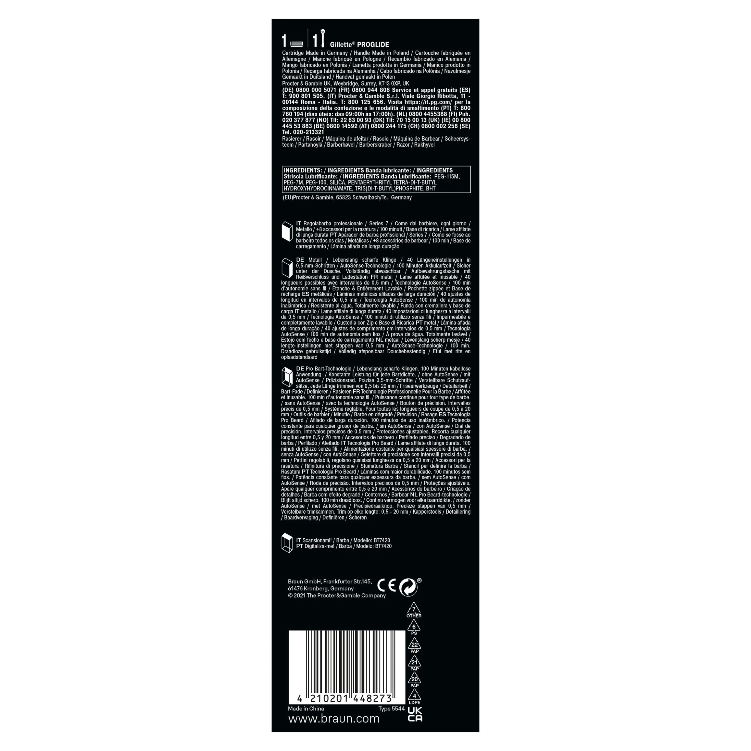 1x Barttrimmer inkl. Pro-Klinge-Trimmeraufsatz 1x Detail-Trimmerkopf 1x Präzisions-Kammaufsatz (0,5–10 mm) 1x Präzisions-Haar-Kammaufsatz (10,5–20 mm) 1x Bartkammaufsatz für Übergänge 1x Gillette ProGlide Rasierer 1x Gillette ProGlide Ersatzklinge 1x Ladestation 1x Bartschablone 1x Reinigungsbürste 1x Aufbewahrungstasche mit Reißverschluss