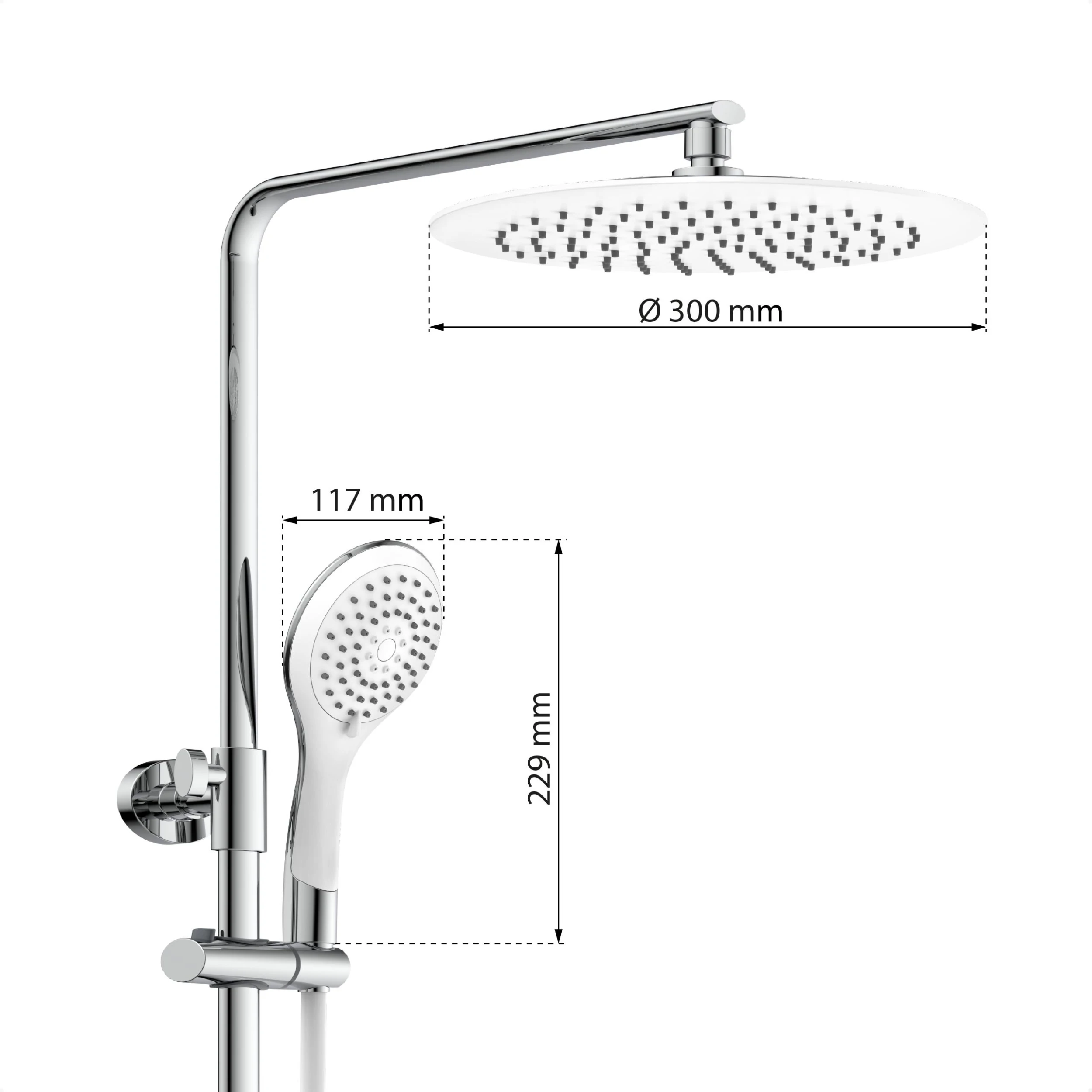 • Handbrause: Kunststoff verchromt, 117 x 229 mm, Faceplate: Weiß