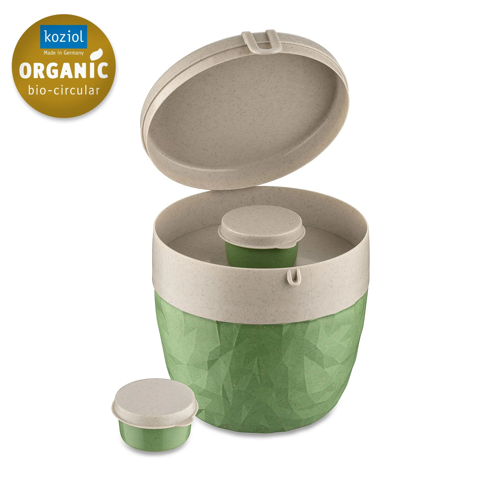Salat to go. Die Lunchdose mit dem frischen Facettendesign ist wie gemacht für Salate, geschnittenes Obst, Müsli und alles, was man erst kurz vor dem Verzehr mischen möchte. Das Oberteil bietet genügend Stauraum für Toppings wie Beeren, Nüsse oder Croutons, die kleine Minidose ist für Salatdressing, Sirup oder Honig gedacht. Alle Zutaten werden in der Dose sauber voneinander getrennt und bleiben appetitlich bis zur Mahlzeit. Meal Prep ist so angesagt wie nie, denn die Gerichte schmecken nicht nur viel besser, sie sind auch viel gesünder und schonen dazu die Umwelt, denn man vermeidet jede Menge Einwegverpackungen. •3-teiliges Lunchbox-Set•inkl. Minidosen für Saucen und Dressings•trennt die Zutaten bis zum Verzehr•ohne Dichtungsring, nur aufrecht stehend transportieren•mikrowellengeeignet, Deckel vorher abnehmen•perfekt für die Mittagspause und unterwegs•das Must-ha ORGANIC BIO-CIRCULAR