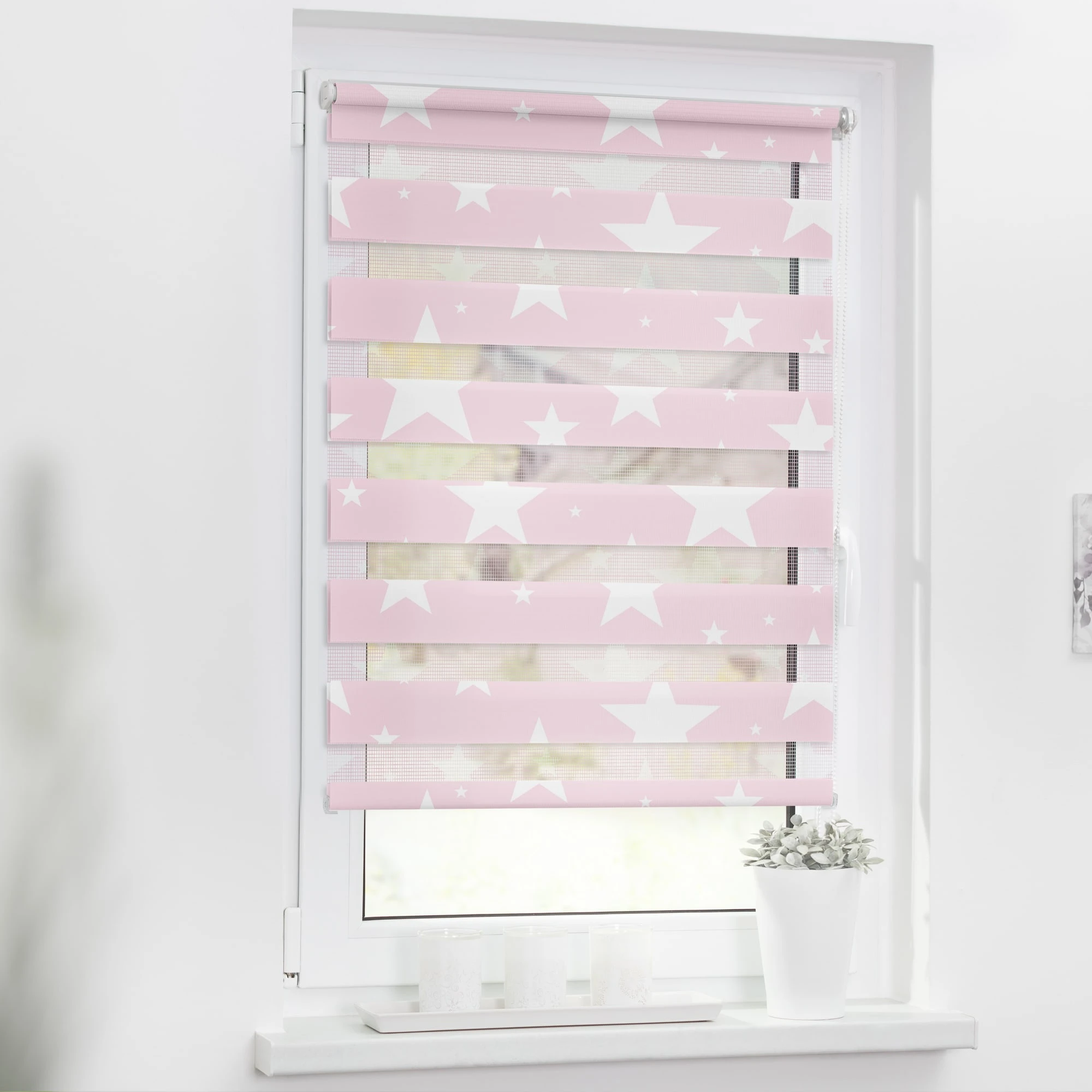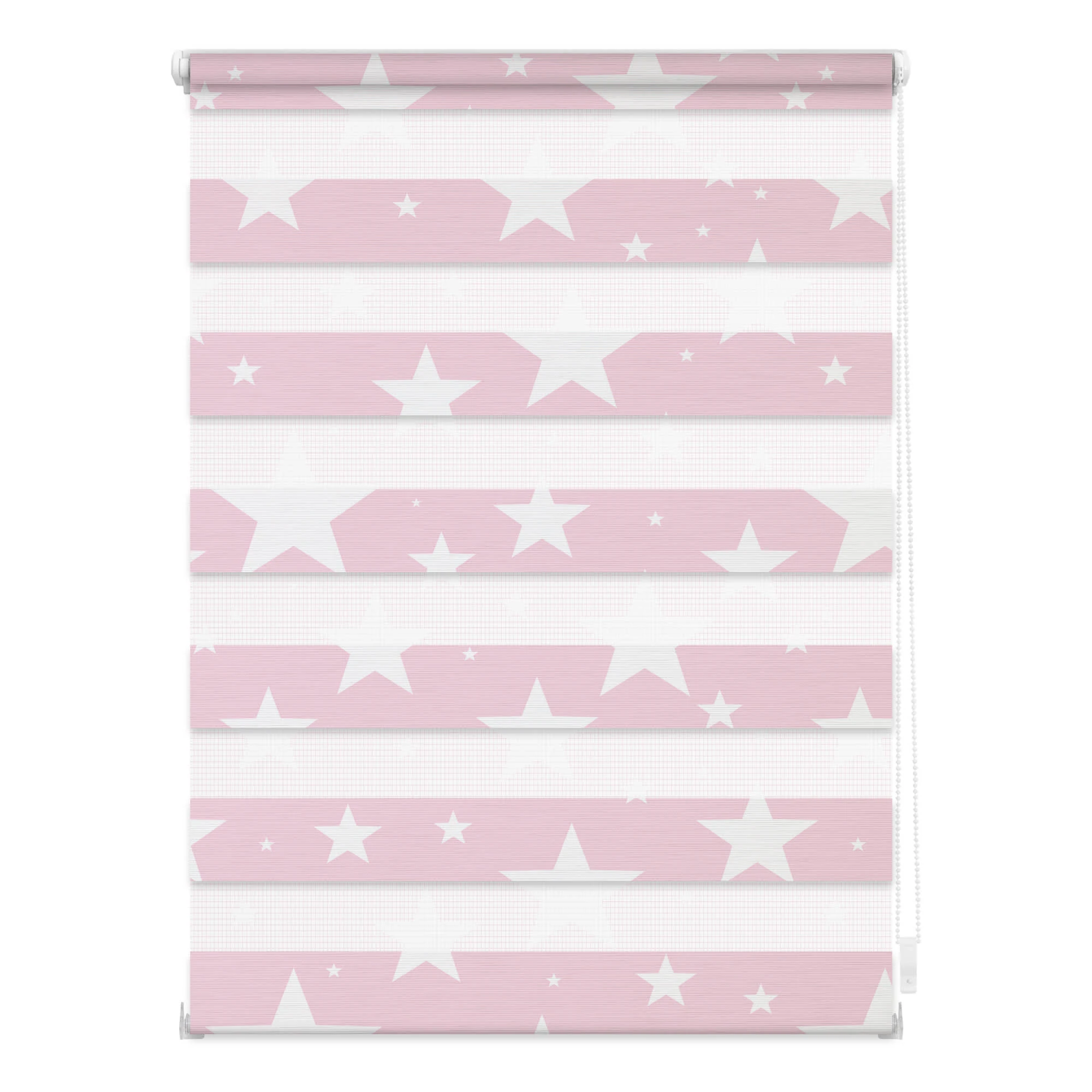 Mit Hilfe des seitlichen Kettenzugs kann die Position der Stoffbahnen punktgenau eingestellt werden, sodass entweder mehr Tageslicht durch die transparenten Streifen dringt oder die blickdichten Streifen zuverlässig vor neugierigen Blicken schützen. Diese Funktion kann in jeder beliebigen Höhe genutzt werden, da sich der Stoff wie bei einem herkömmlichen Seitenzugrollo komplett auf- und abrollen lässt.