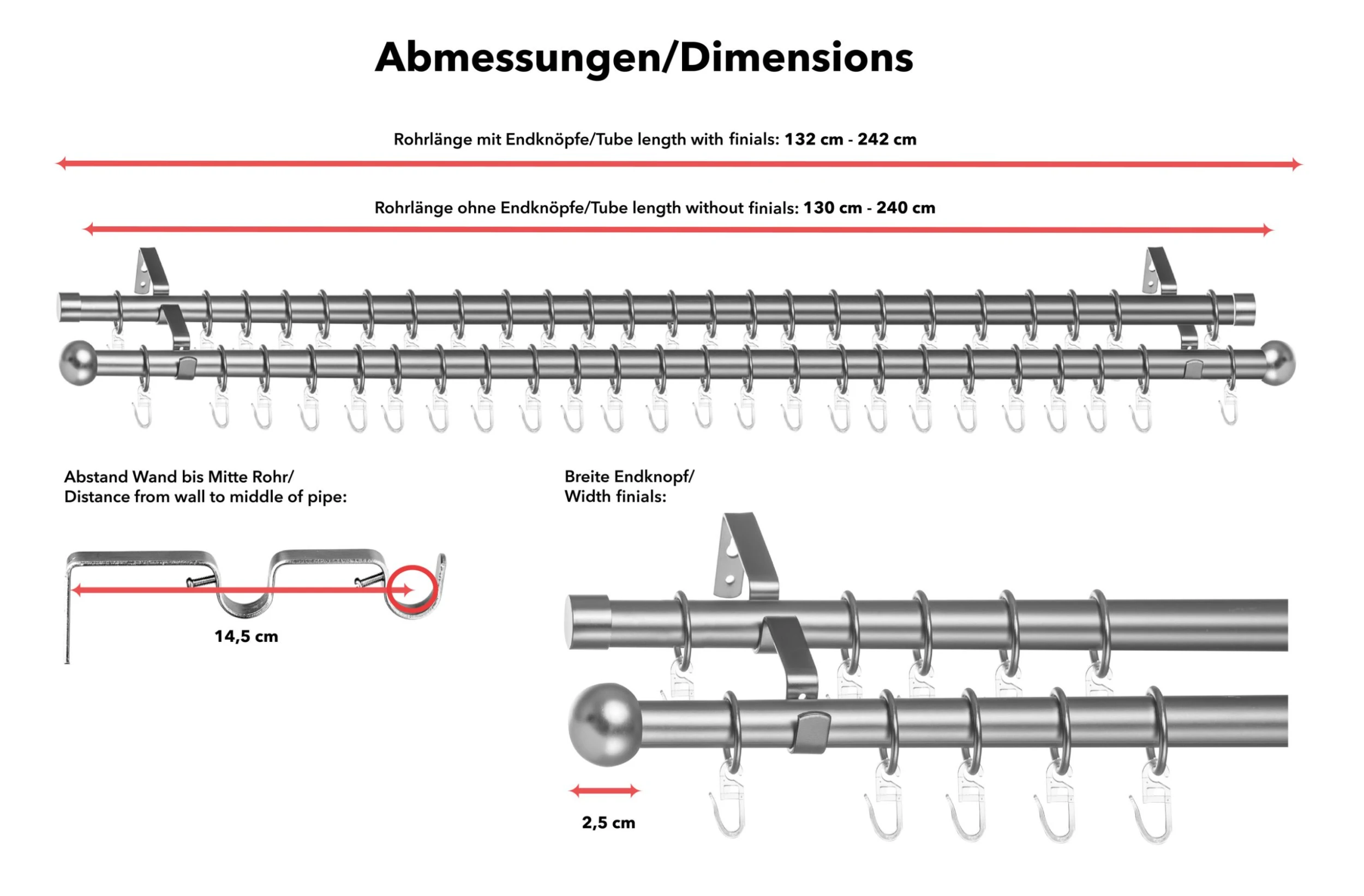Der Vorzug bei dieser Vorhangstange ist die individuelle Anpassung auf die gewünschte Länge. Die zwei Rohre haben unterschiedliche Durchmesser (16 und 19 mm) und können so ineinander verschoben werden. Sollte die Gardinenstange dennoch zu lang sein, können die Rohre ganz einfach mit einer Metallsäge auf das Wunschmaß gekürzt werden (Maßanfertigung Gardinenstange).