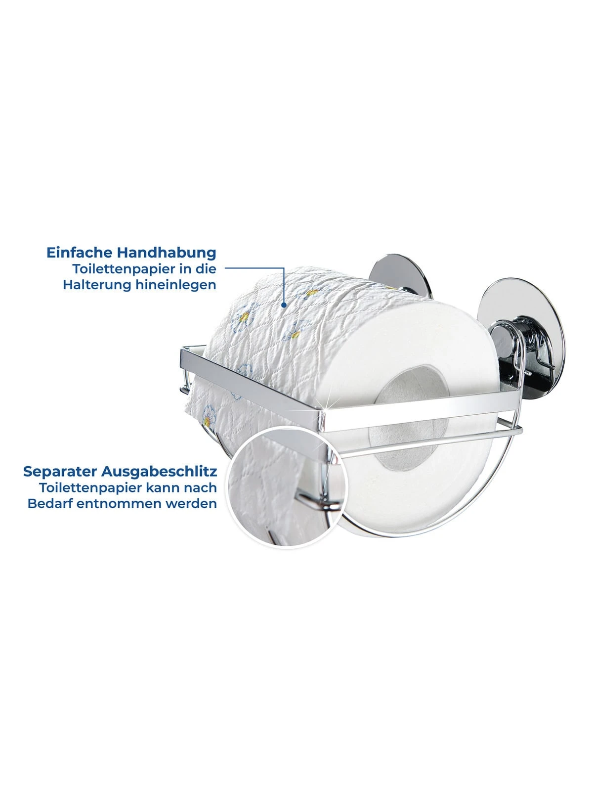 Die Toilettenpapierrolle wird einfach in den Halter hineingelegt. Durch den separaten Ausgabeschlitz kann das Papier nach Bedarf entnommen werden.