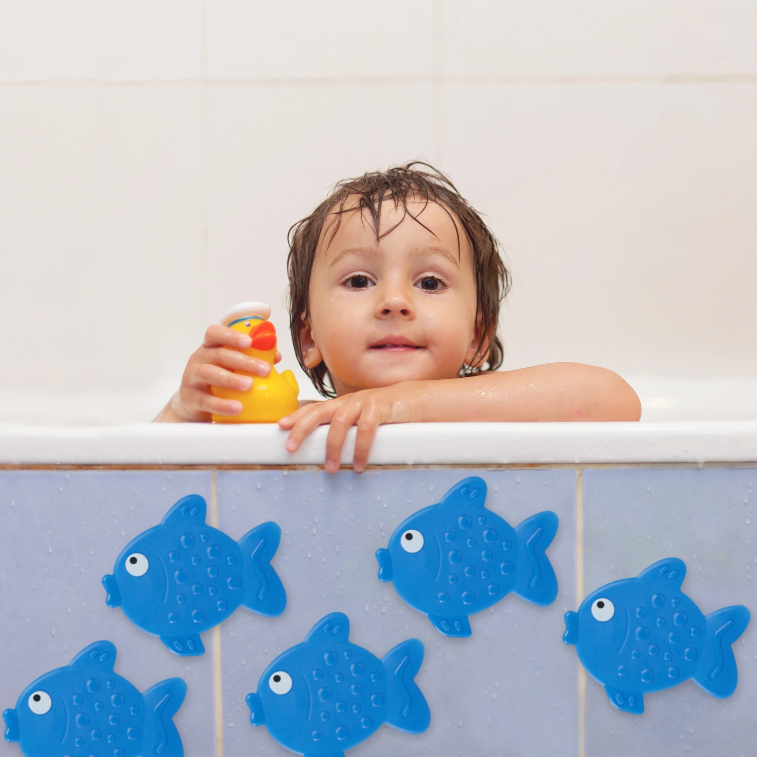 Die spaßigen Badesticker können in der Dusche oder in der Badewanne die Rutschgefahr vermindern. Dabei überzeugen die Aufkleber mit ihrem witzigen Design. Die 10 niedlichen Fische bereiten nicht nur Kindern im Bad eine Freude, sondern sind auch für Erwachsene schön anzusehen. Dank der Saugnäpfe können Sie die Duschaufkleber problemlos an einem glatten Untergrund wie Fliesen festdrücken. Feuchten Sie die Saugnäpfe dafür vorher leicht an. Die Pads sind einfach wieder zu entfernen.