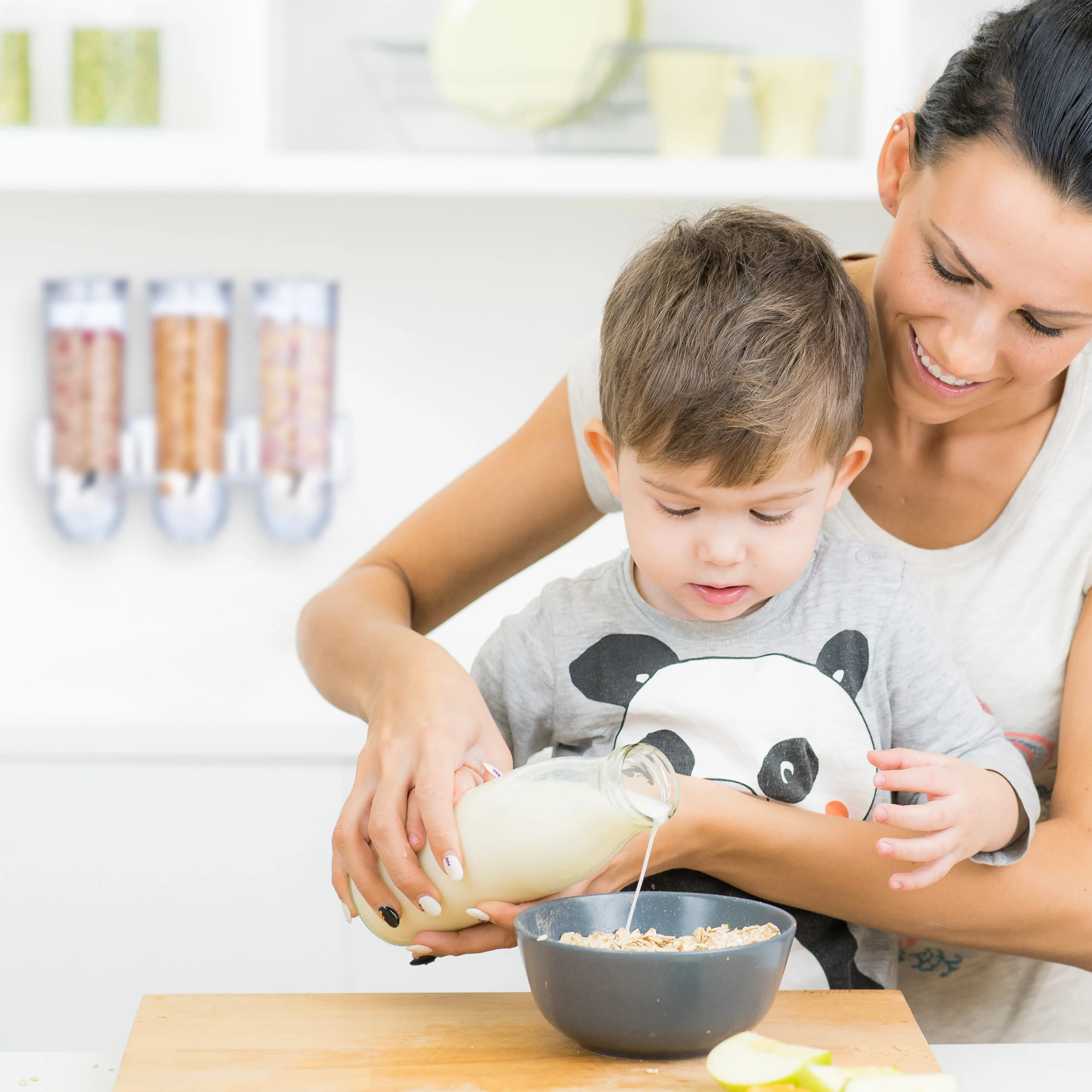 Zudem besitzt jeder Müslibehälter eine Auffangschale in Form einer Tasse, die an den Spender geklemmt oder darunter auf die Küchenleiste gestellt wird. Diese können ebenfalls zum Portionieren genutzt werden.