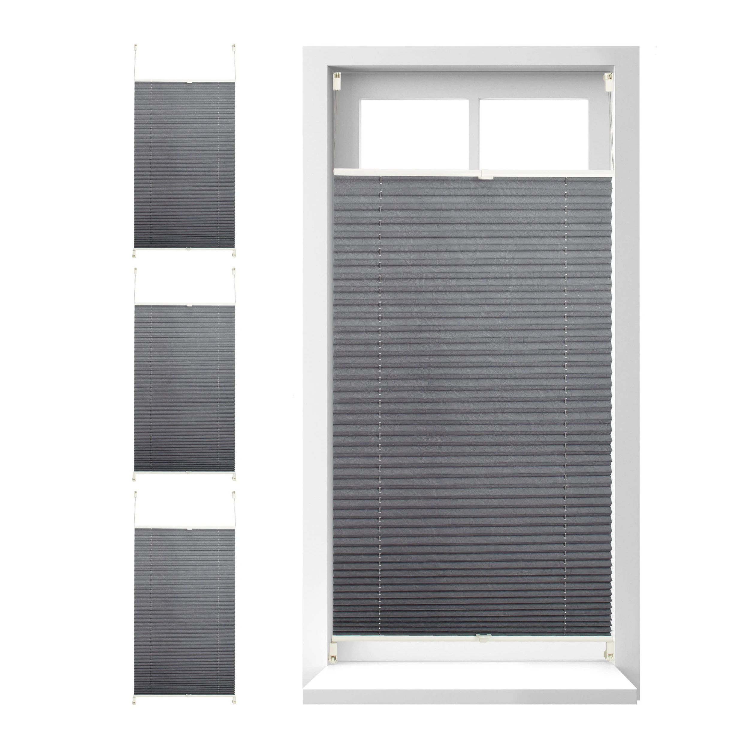 Mit diesen schönen grauen Plissees verhindern Sie neugierige Blicke Ihrer Nachbarn ohne Ihre Zimmer ungemütlich zu verdunkeln. Die Faltstores sind stufenlos einstellbar – schieben Sie sie mit den 2 praktischen Griffen einfach auf die gewünschte Höhe. Die Montage ist kinderleicht und geht schnell von der Hand. Klemmen Sie die Rollos einfach am Fenster fest und fixieren Sie sie mit den mitgelieferten Klebepads.