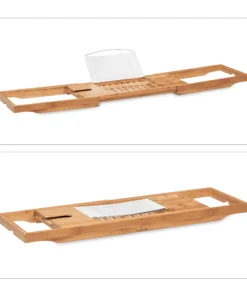 Mit dem Badewannentisch inklusive Weinglashalter, Seifenablage und Buchhalter verwandelst Du Deine Badewanne in Deinen ganz persönlichen Wellnessbereich. Das ausziehbare Badetablett passt in jede klassische Wanne und besteht aus widerstandsfähigem Bambus. Dadurch ist der Badewannenbutler besonders feuchtigkeitsresistent. Dank Stopper und weiß bespannter Tablethalterung kannst Du den perfekten Betrachtungswinkel für Buch oder Tablet einstellen und so beste Unterhaltung beim Baden genießen.