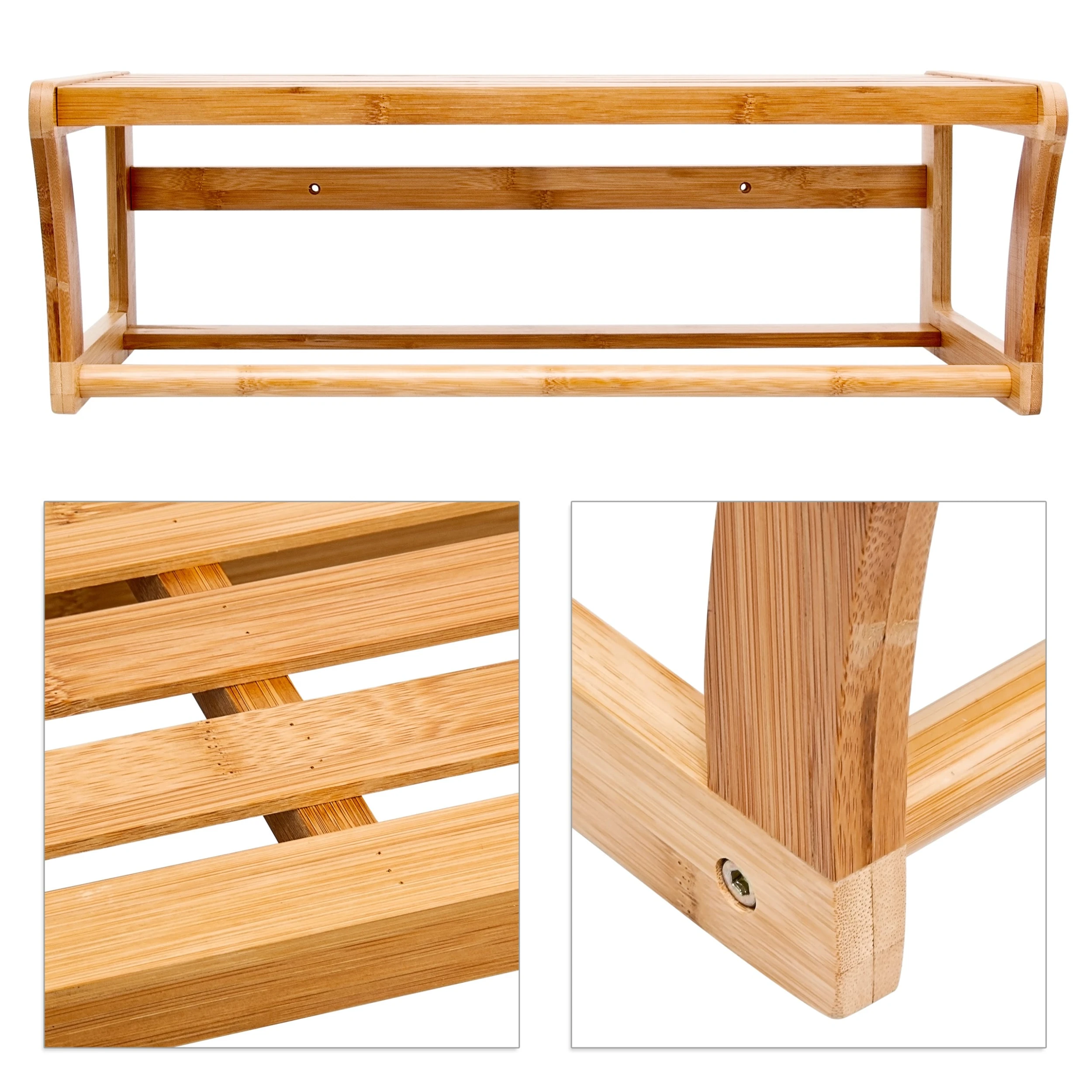 Mit diesem Wandregal mit integrierter Handtuchstange schaffen Sie auch im kleinsten Badezimmer wertvollen Stauraum. Die große Ablage bietet genügend Platz für frische Handtücher, Kosmetika oder auch Dekoartikel. Auf der breiten Handtuchstange trocknen Badetücher oder auch feuchte Kleidungsstücke schnell und ohne dabei unangenehm stickige Gerüche zu entwickeln. Das Wandregal aus natürlichem Bambus fügt sich mit der warmen Holz Optik dezent in Ihr Badezimmer ein.