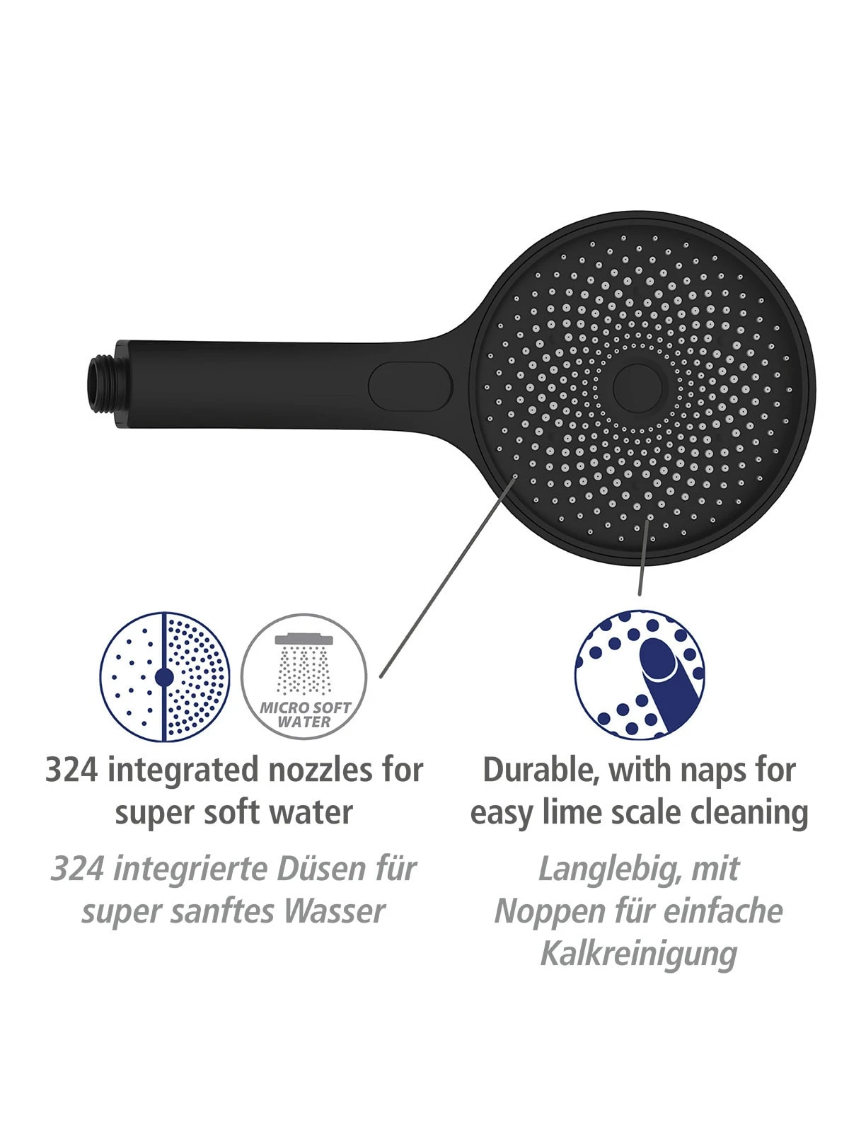 Für eine sanfte Reinigung des Körpers sorgen 324 integrierte Düsen, die das Wasser in wohltuenden, mikrofeinen Tropfen aus dem Duschkopf fließen lassen. Daneben gewährleistet der komfortable Brausekopf eine effektive und zu gleich behutsame Dusche. Bei der Softwater Universal-Handbrause können Sie neben der Softwater-Funktion, die wie ein sanfter Tropenschauer entspannt, zwischen zwei weiteren Strahlarten wählen: Genießen Sie ganz nach Belieben eine weichere Variante oder die starke Intensive-Funktion. Für welche Strahlart sie sich auch entscheiden, die Handbrause ist leise in der Funktion und besonders spritzarm.