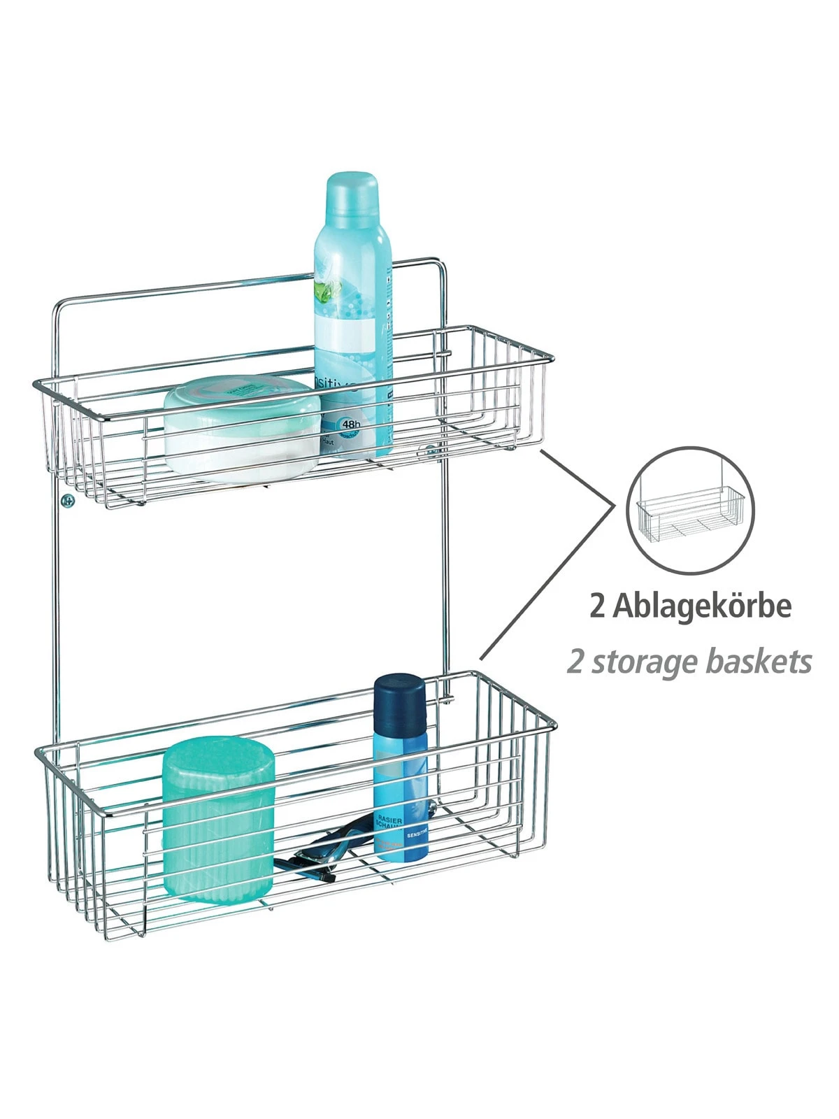 Das praktische Wandregal Avesta in edler Ausführung aus glänzendem Chrom bietet mit zwei Ablagekörben viel Platz für Pflege-Artikel und hält diese stets griffbereit.