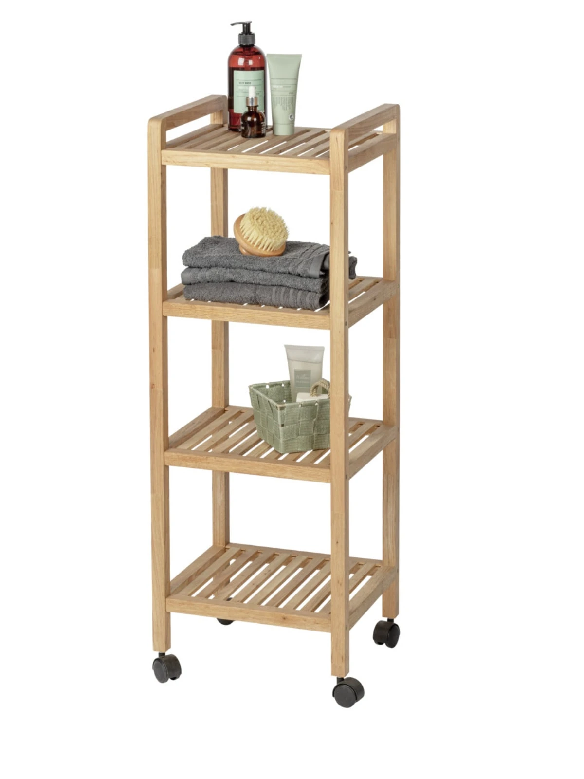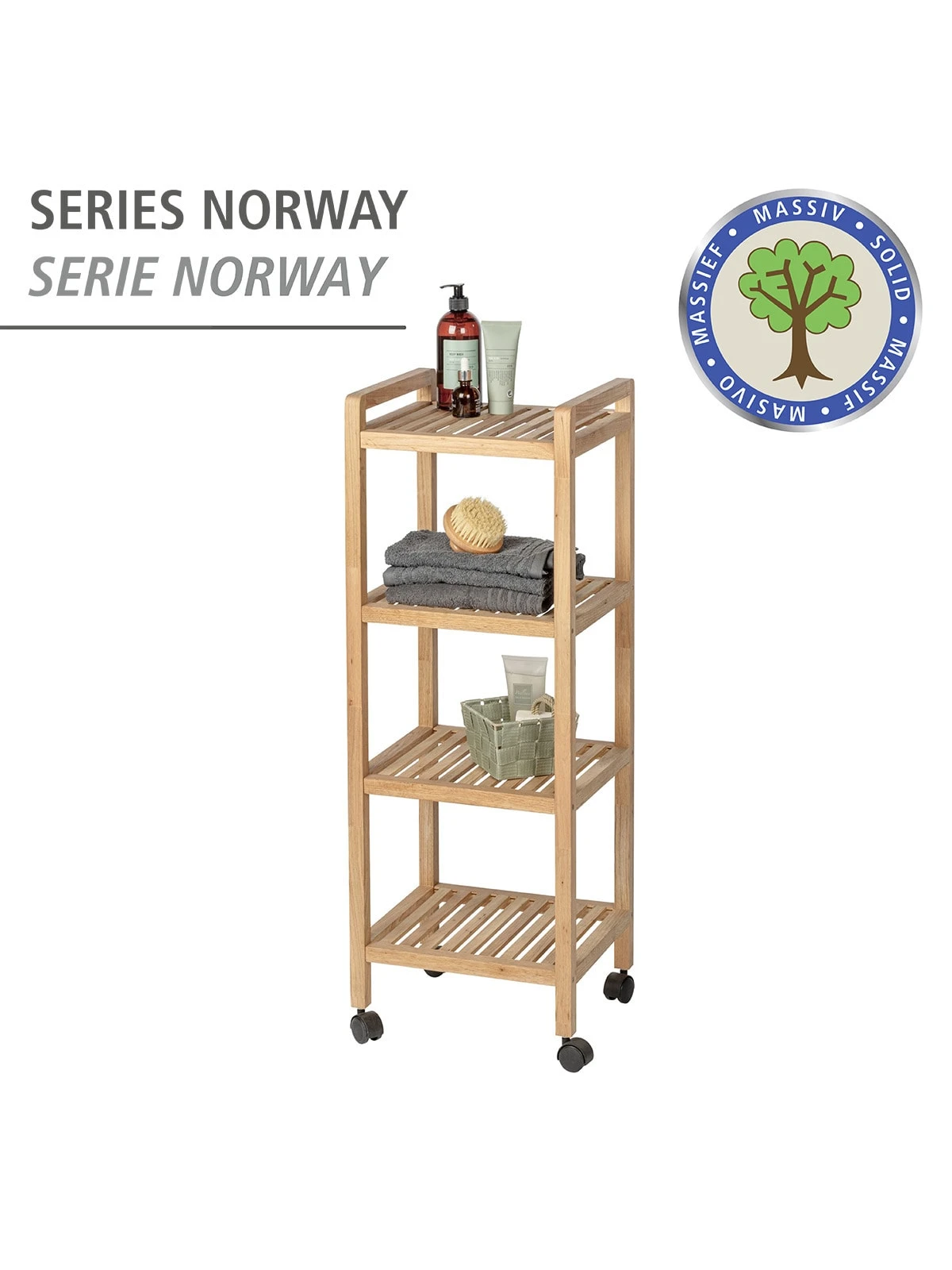 Der moderne Haushalts- und Badwagen Norway ist ein echtes Multi-Talent und bietet mit seinen vier Regalböden viel Platz für Handtücher, Küchenutensilien, Bücher, Accessoires und vieles mehr. Durch seine vier Rollen ist er mobil und flexibel einsetzbar. Dank seiner schmale Form kann das Roll-Regal platzsparend positioniert werden.