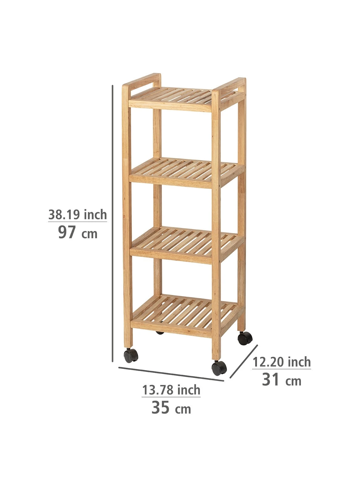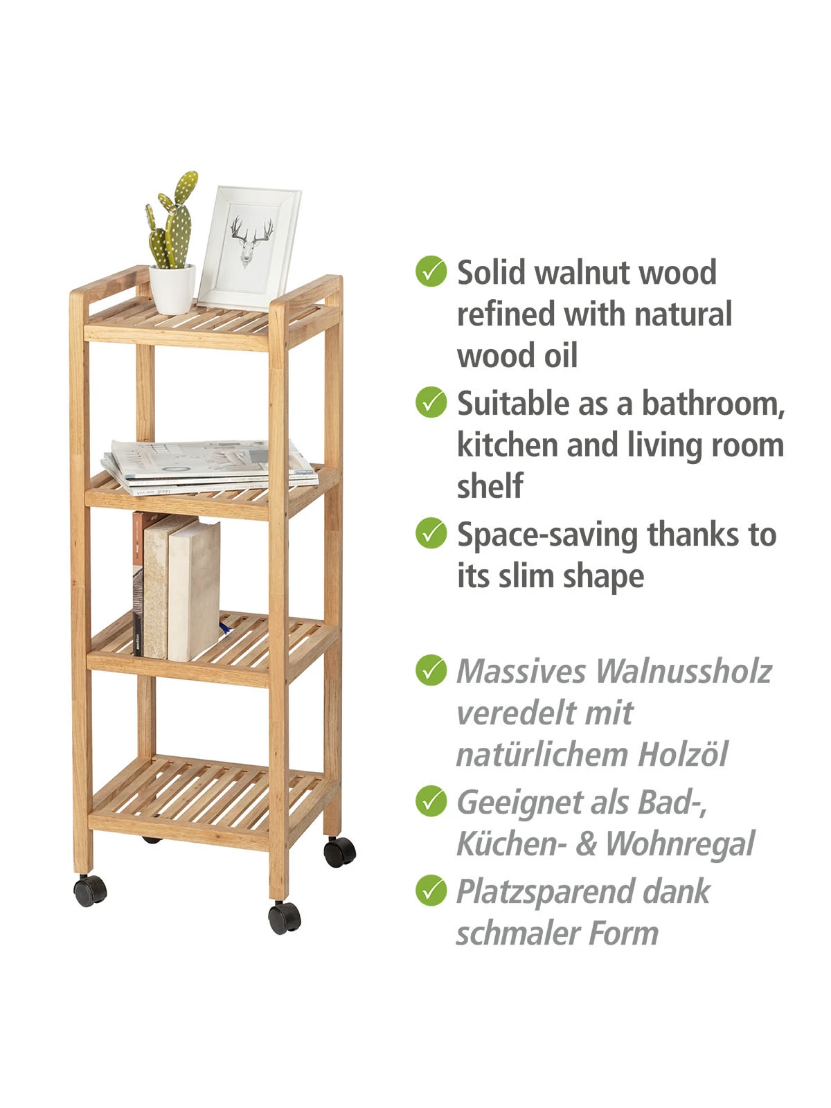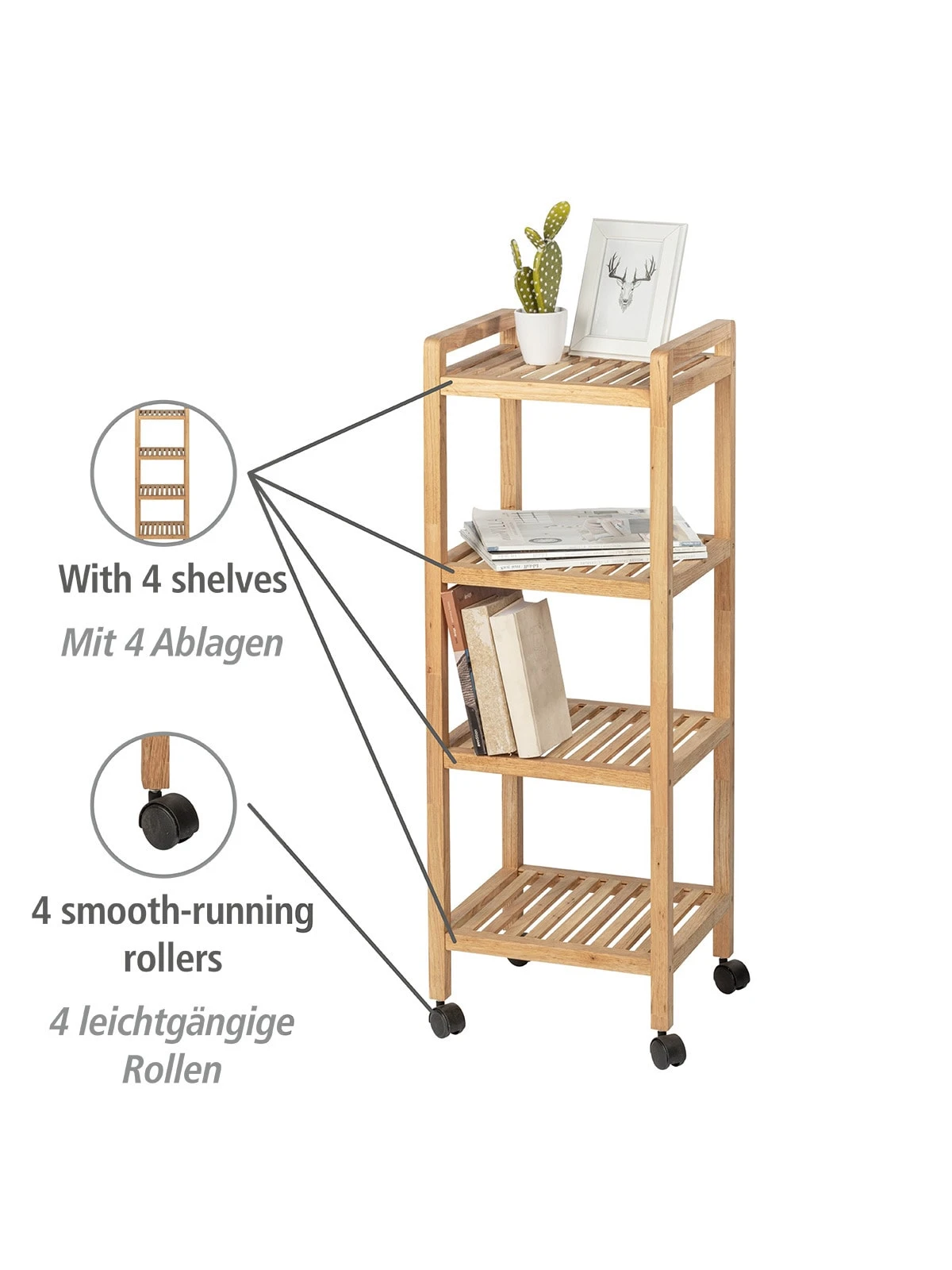 Das fahrbare Bad-, Küchen- & Wohnregal sorgt für großzügige und dekorative Abstell- und Transportmöglichkeiten für Badezimmer, Küche, Esszimmer, Wohnzimmer oder Terrasse und Balkon. Auf dem Wagen mit vier leichtgängigen Spezialrollen lassen sich Frühstück, Getränke oder Partyessen und Grillgut schnell und einfach von einem zum anderen Ort transportieren. Als mobile Hausbar ist der Servierwagen auch bestens geeignet.