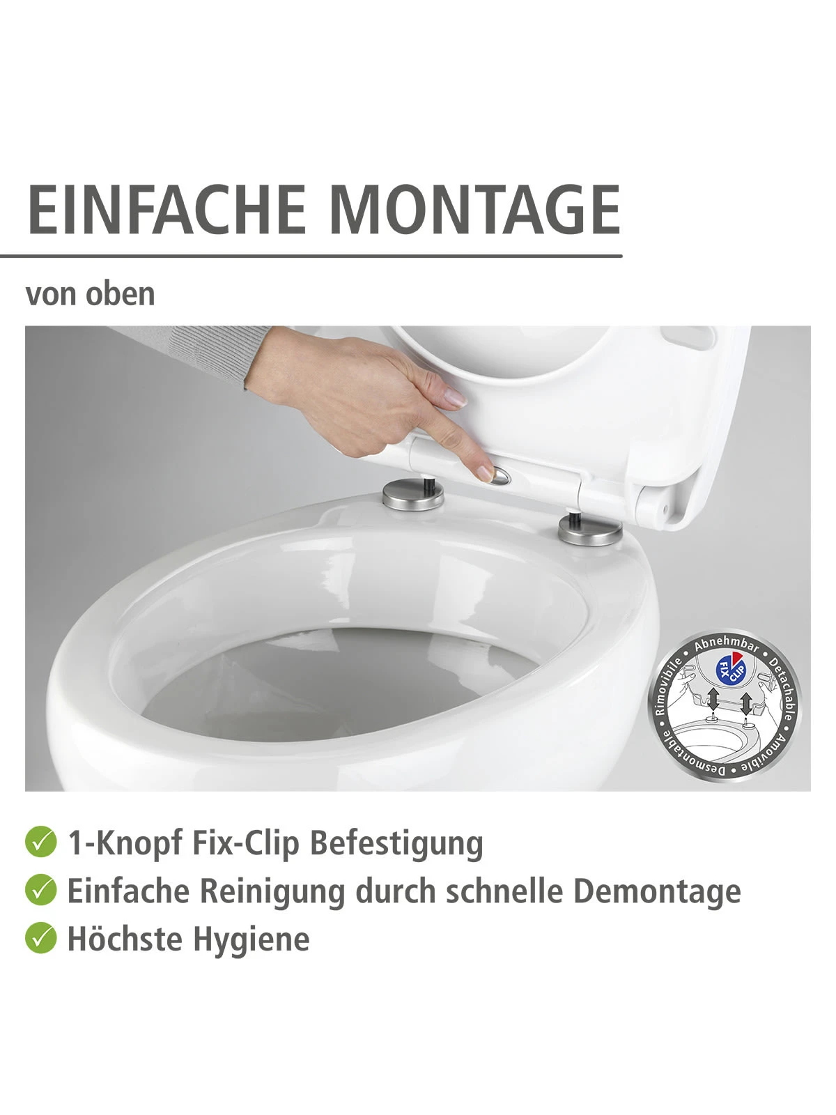 Seine Fix-Clip Hygienebefestigung aus Kunststoff ermöglicht nicht nur eine schnelle Montage, sondern auch Reinigung, da der komplette Sitz einfach wieder abnehm- und aufclipsbar ist. Diese ist außerdem flexibel einstellbar passend für handelsübliche WCs. Ein Wandpuffer ist im Lieferumfang enthalten.