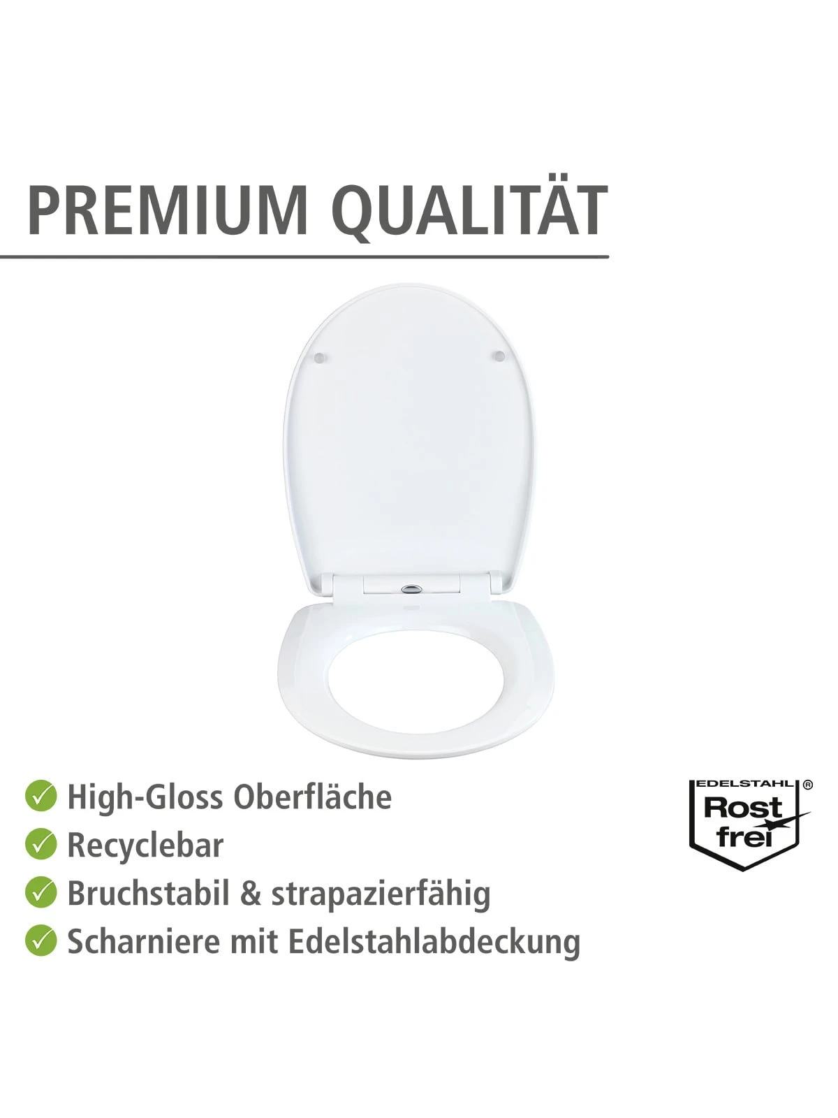 Der Premium WC-Sitz Beach ist aus sehr bruchstabilem, recyclingfähigem Thermoplast hergestellt und mit bis zu 350 kg belastbar. Die Oberfläche ist mit einem weichen Lappen leicht zu reinigen.