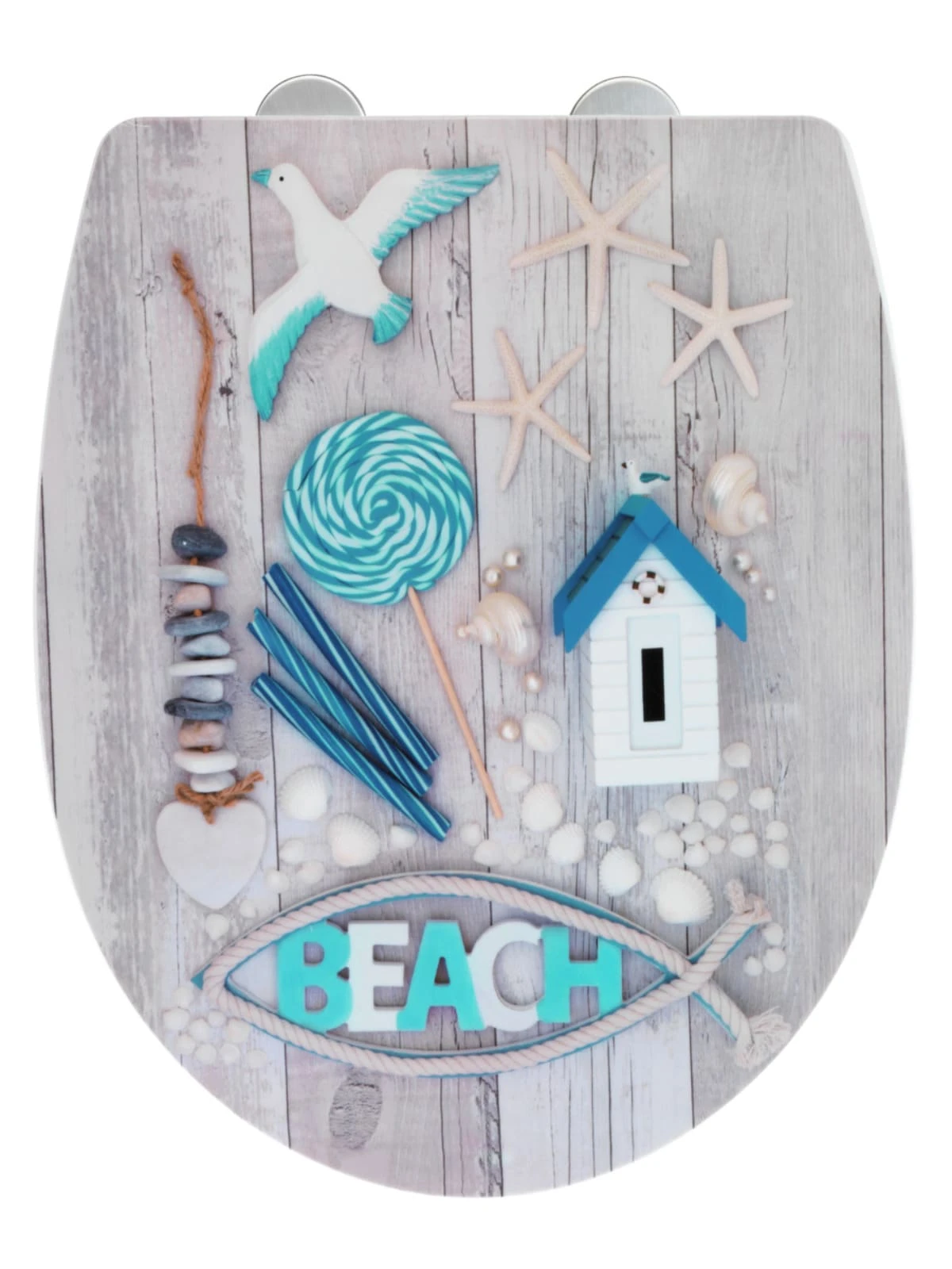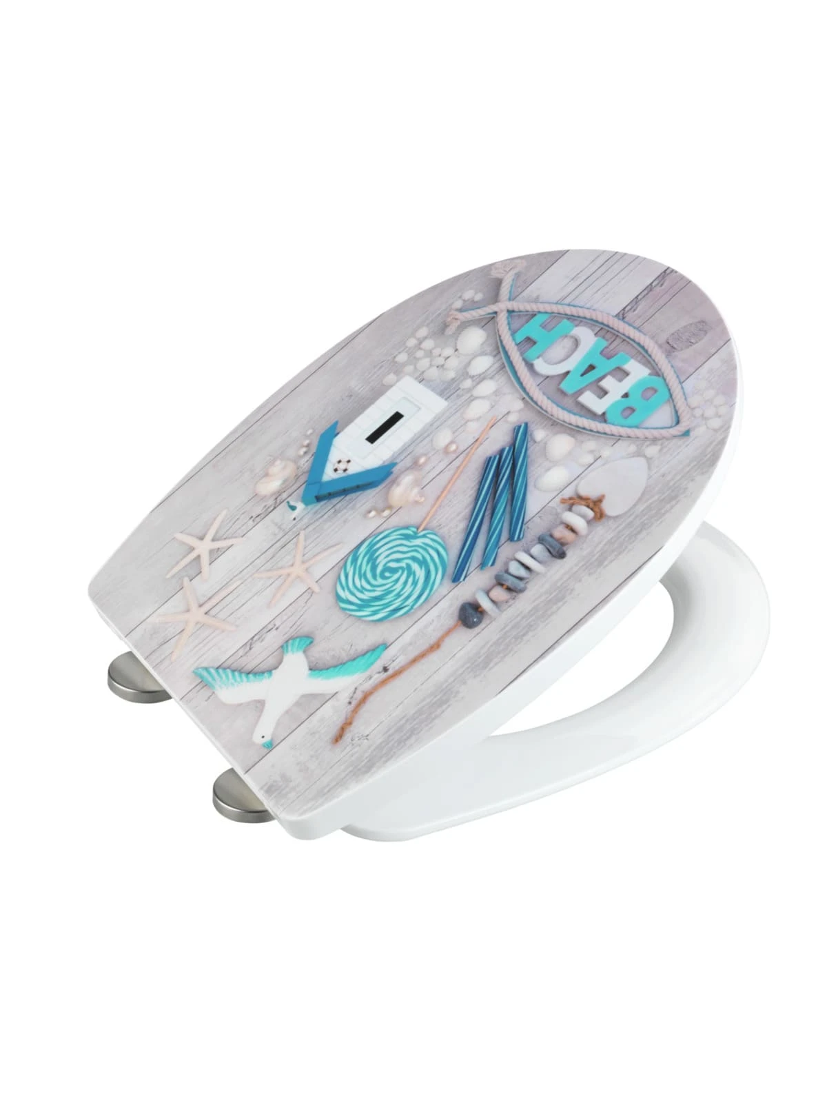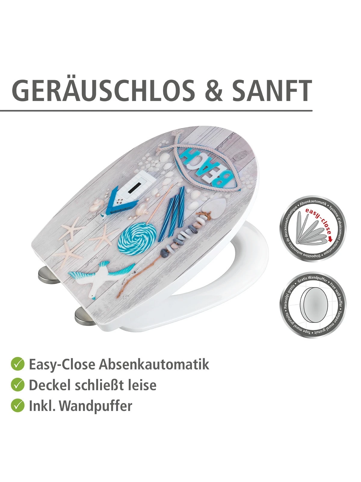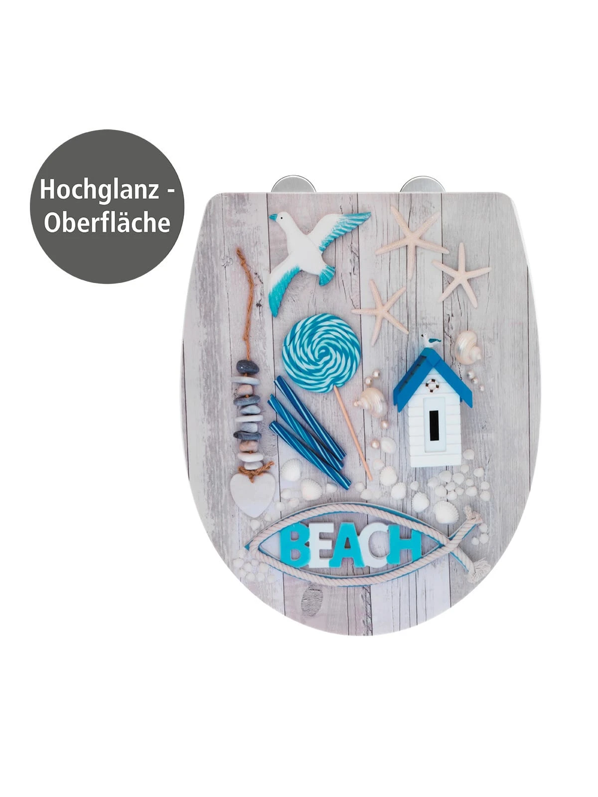 Der hochwertig verarbeitete Premium WC-Sitz Beach aus Thermoplast hat eine klassische ovale Deckelform. Er verfügt nicht nur über einen angenehmen Sitzkomfort, sondern ist mit praktischen Zusatzfunktionen ausgestattet. Die attraktive hochglänzende Oberfläche kombiniert mit dem ausgefallenen Design wertet jedes Badezimmer auf und versprüht Urlaubs-Flair.