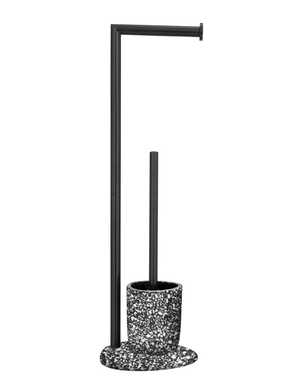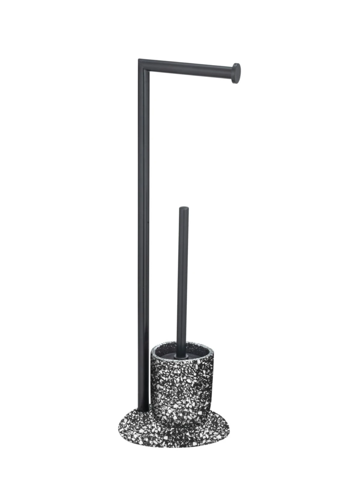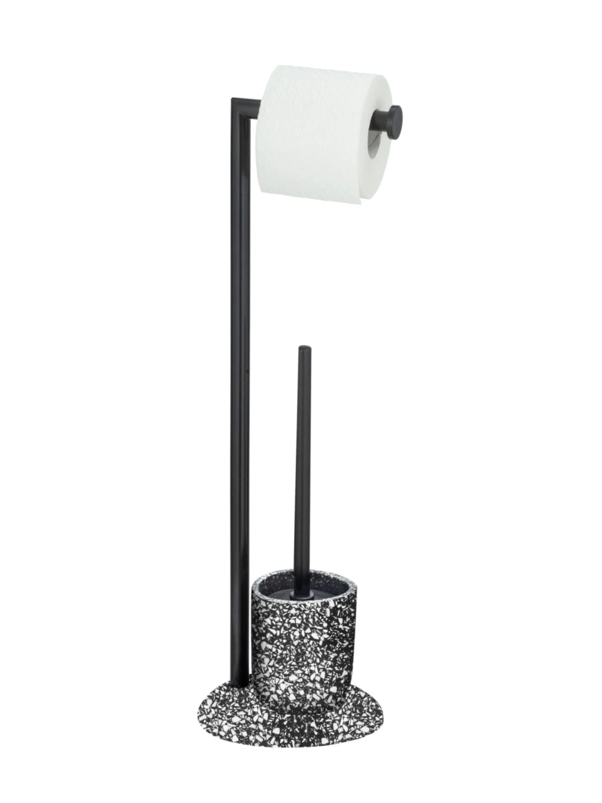 Die extravagante Standgarnitur schmiegt sich stilvoll in jedes Bad & Gäste WC. Das schöne Accessoire der Serie ist in elegantem Design gehalten. Der in rundlicher Form gehaltene Fuß des praktischen Badzubehörs sorgt für einen sicheren Stand. Die sich darauf befindende Rollenhalterung ist aus schwarz lackiertem Stahl gefertigt. Unterhalb der Konstruktion befindet sich der mattschwarze Bürstenhalter. Dieser besticht – wie auch der Standfuß – mit atemberaubenden Details in Weiß und überzeugt durch einfache Farben.