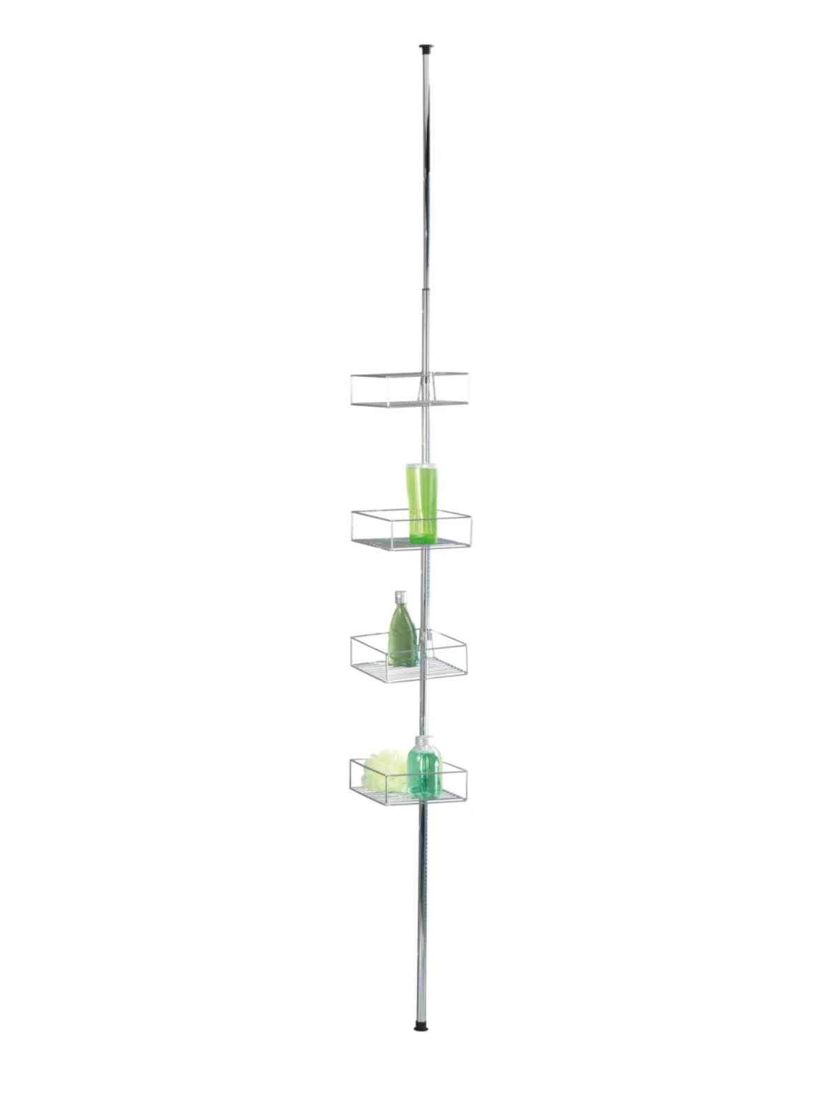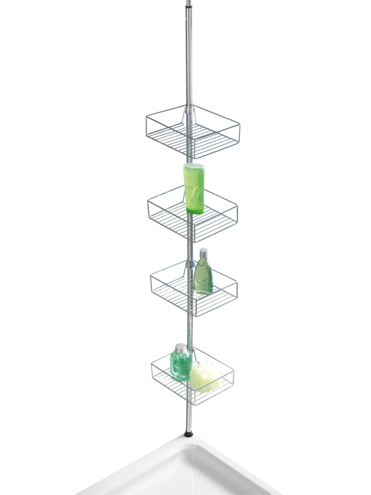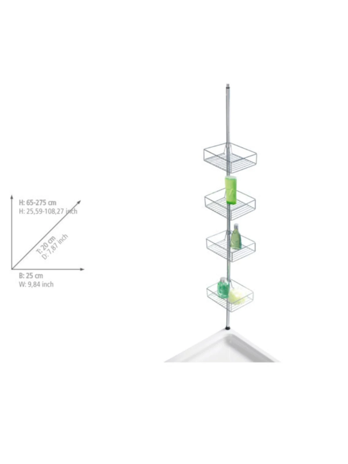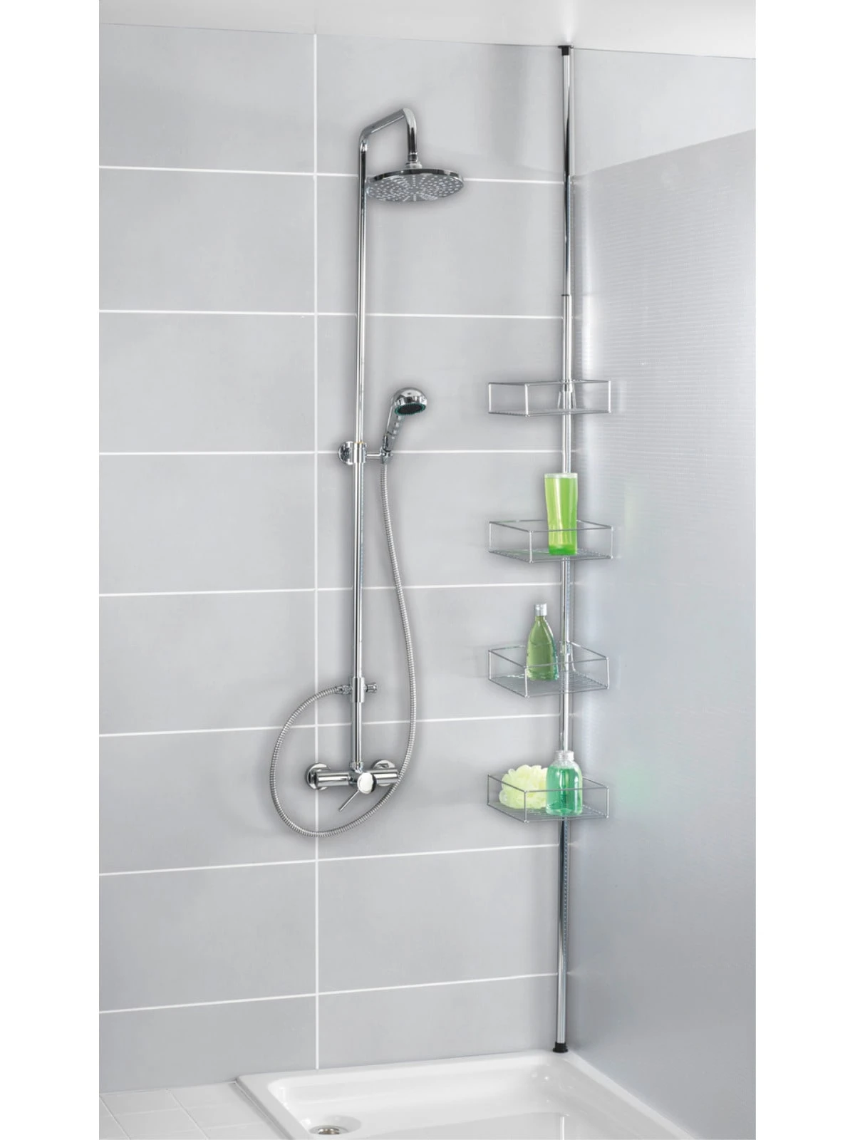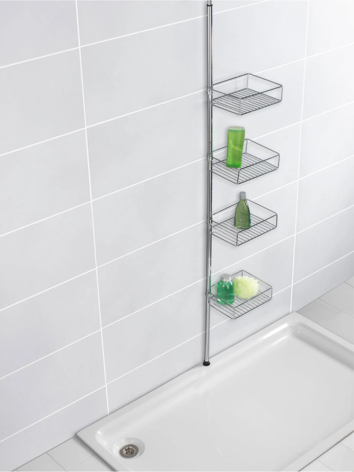 Die Montage ist schnell und leicht – ohne Bohren, da das praktische Teleskop-Regal einfach zwischen Boden und Decke geklemmt wird, egal ob in der Duschkabine, Badewannenecke oder im Badezimmer. Die Ablagekörbe sind individuell positionierbar und verstellbar.