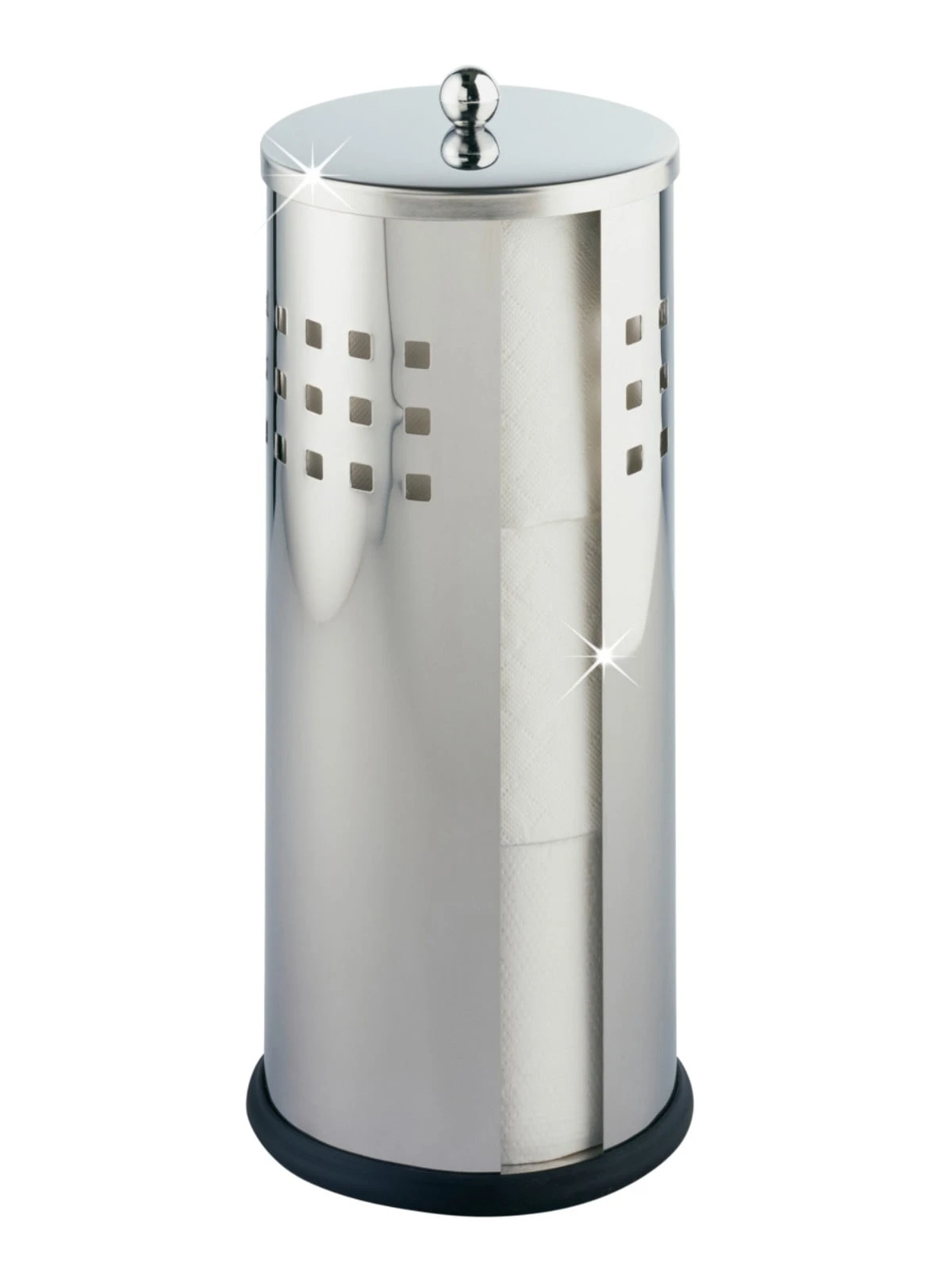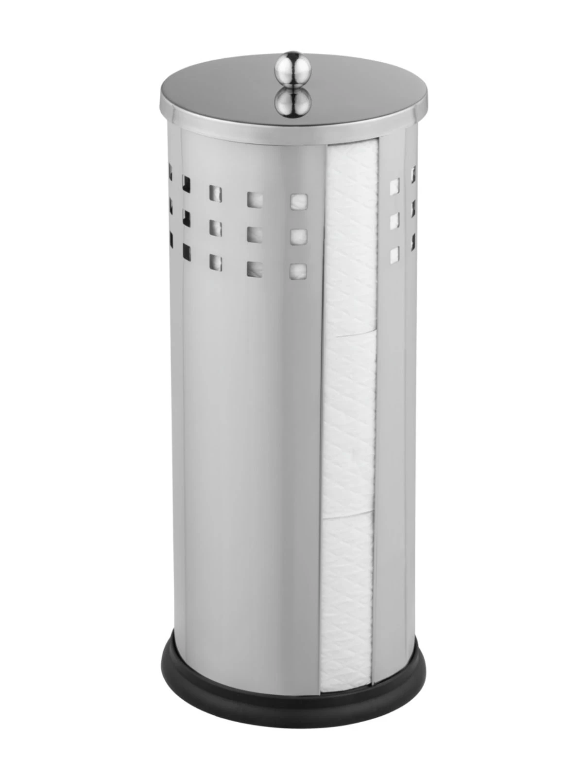 Die geschlossene Form im Lochdesign hat eine Aussparung für eine bessere Übersicht und zum einfachen Entnehmen der Rollen. Der Ersatzrollenhalter bietet Platz für 3 Toilettenpapierrollen.