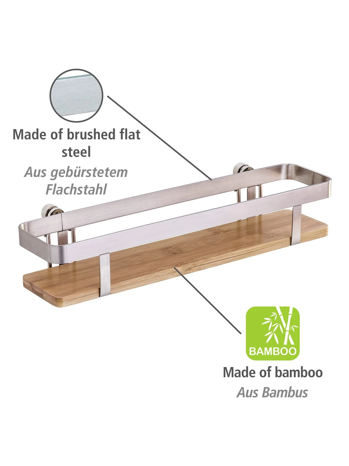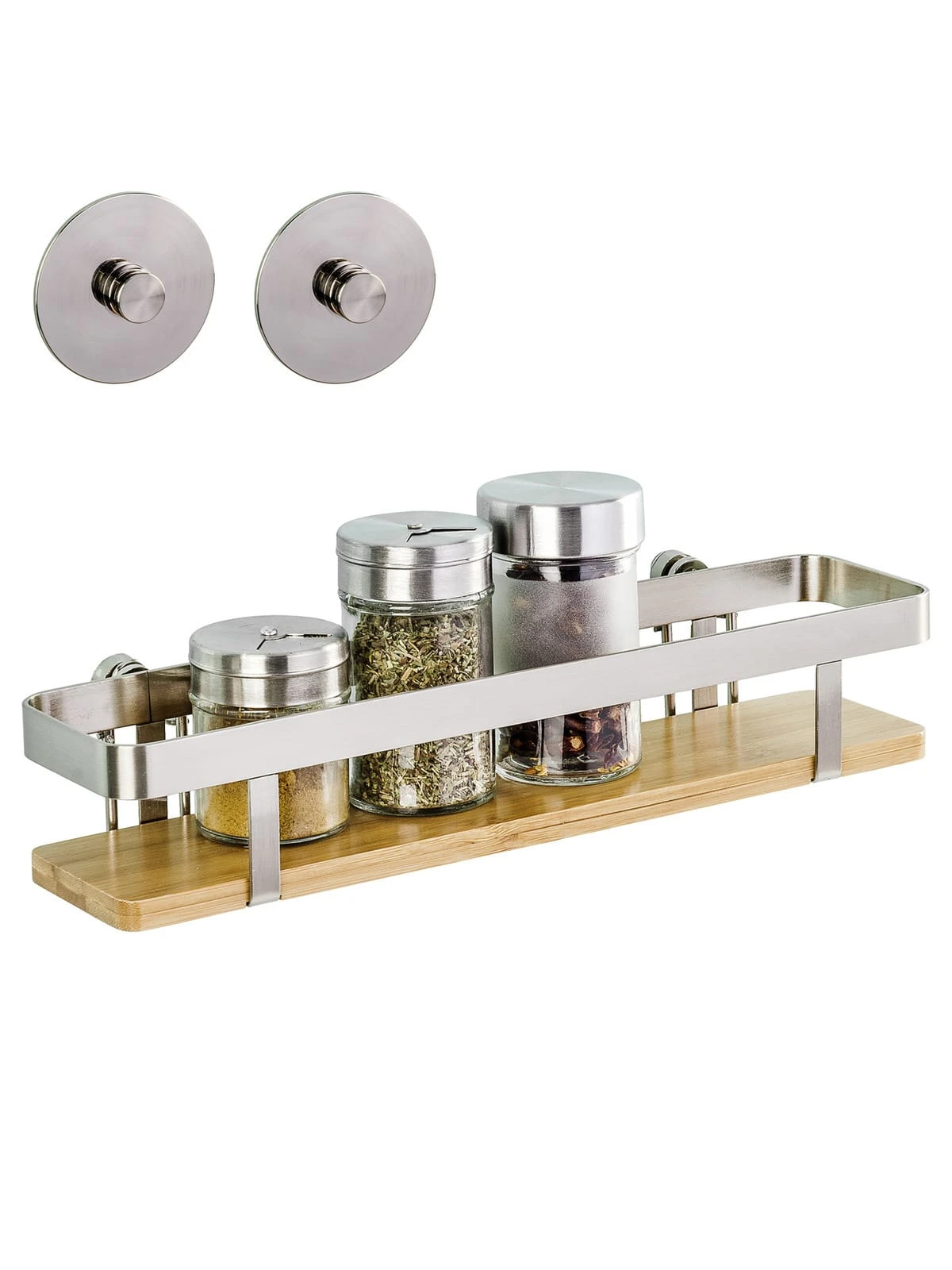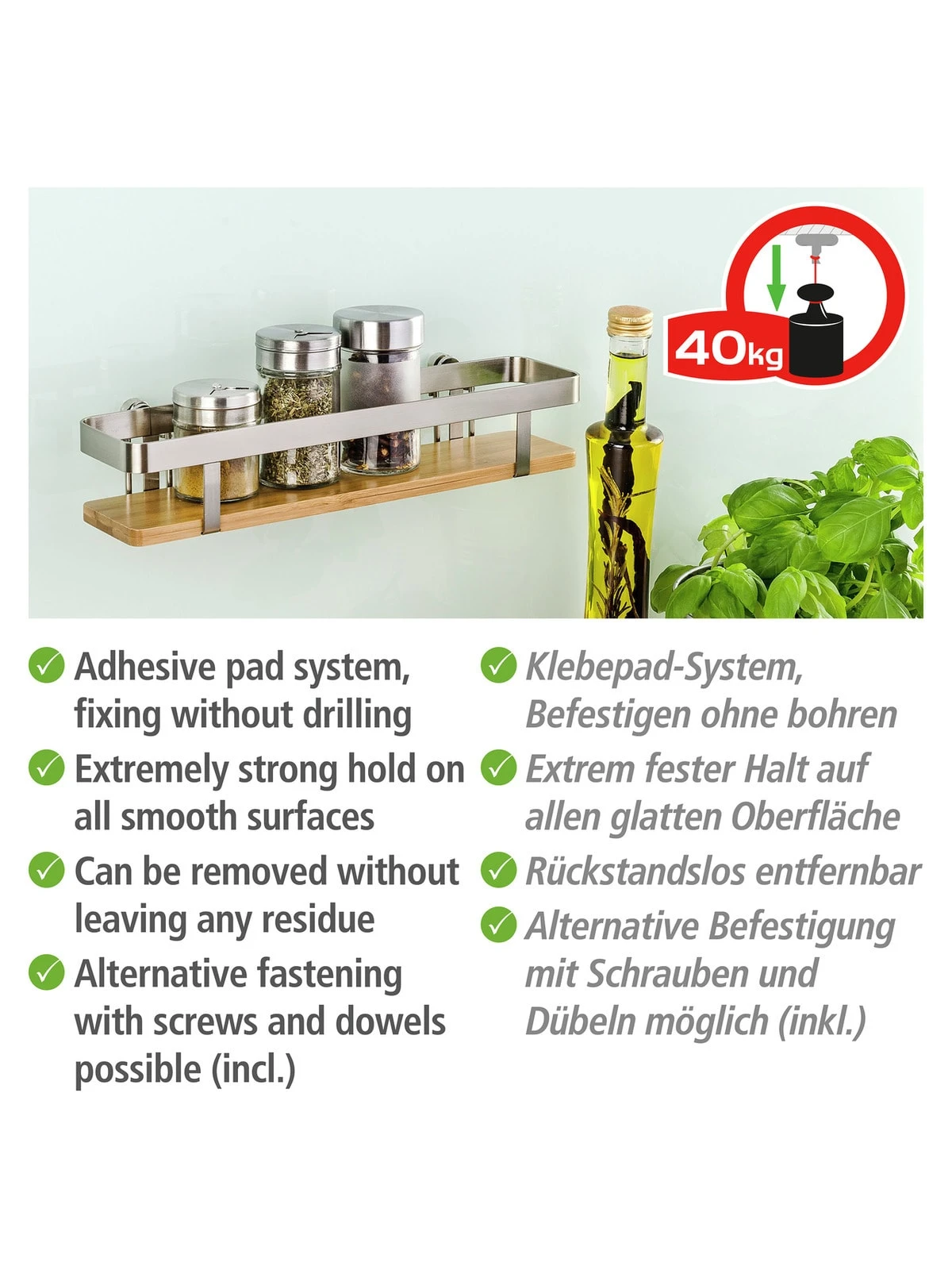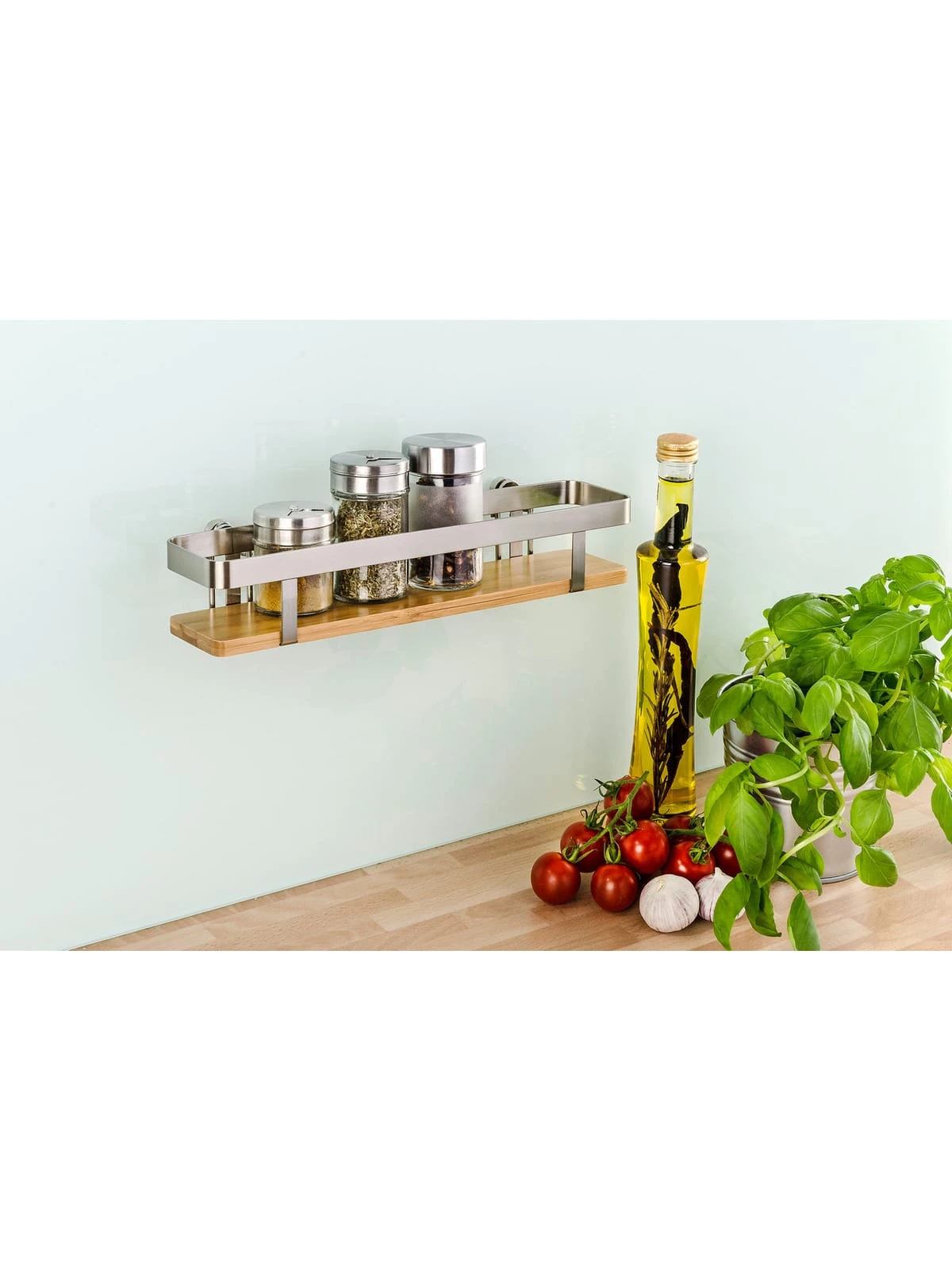 In dem dekorativen Gewürzbord der WENKO Premium-Serie aus hochwertigem, gebürstetem Flachstahl sind alle Gewürze beim Kochen stets griffbereit aufbewahrt. Das Regal mit einer Ablagefläche (30 x 7 cm) aus modernem Bambus bietet ausreichend Platz für bis zu sechs handelsübliche Gewürzbehälter. Natürlich finden auch Flaschen (Öl, Essig, etc.), weitere Dosen und viele Küchenhelfer eine attraktive Aufbewahrungsmöglichkeit in Griffnähe.