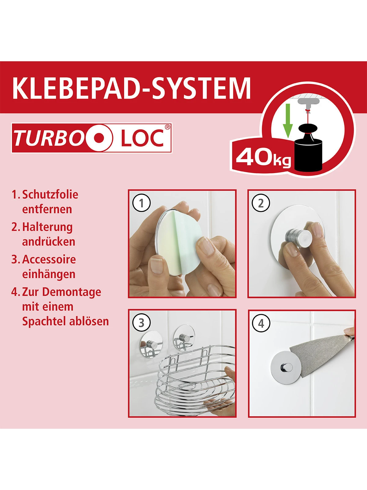 Die Turbo-Loc® Wandbefestigung ist ein Klebesystem mit extrem festem Halt auf allen glatten Oberflächen. Einfach die Schutzfolie der beiden Klebepads entfernen, die Halterung an der gewünschten Stelle fixieren und anpressen.