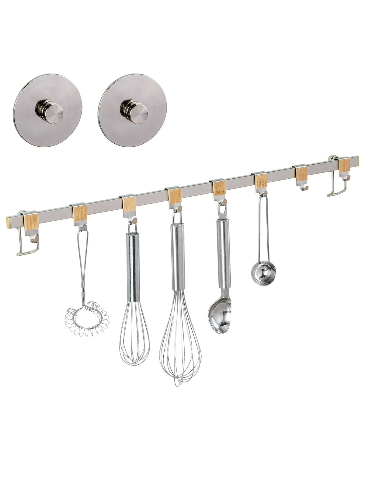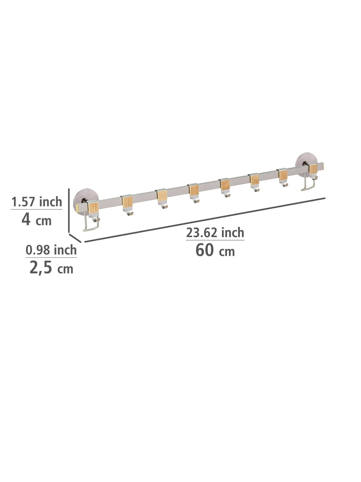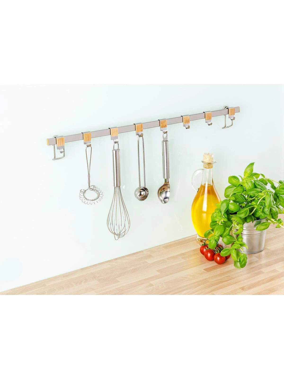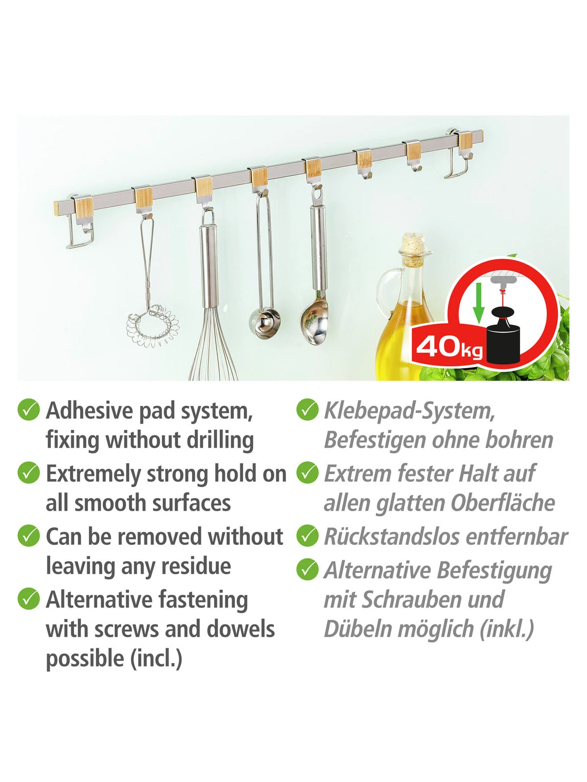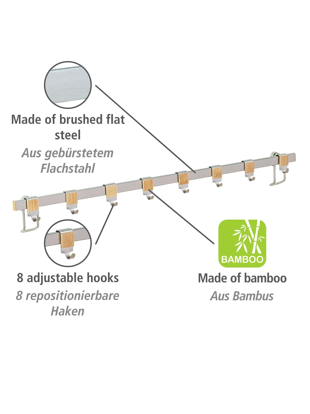 Die elegante Haken-Leiste der WENKO Premium-Serie aus hochwertigem, gebürstetem Flachstahl lässt sich über der Arbeitsfläche in der Küche anbringen, so dass alle Kochutensilien schnell griffbereit sind. Die funktionale Aufhängung schafft zusätzlichen Raum in der Küche und bietet eine geordnete Übersicht beim Kochen oder Backen. Einfach die Küchenhelfer wie Schneebesen, Suppenkelle, Pfannenwender, Schere, etc. an den acht beiliegenden Haken aufhängen, schon schaffen Sie Ordnung und zusätzlichen Stauraum auf 60 cm Breite. Die acht praktischen Haken sind aus hochwertigem Edelstahl gefertigt und mit einer schönen Bambus-Applikation verziert.