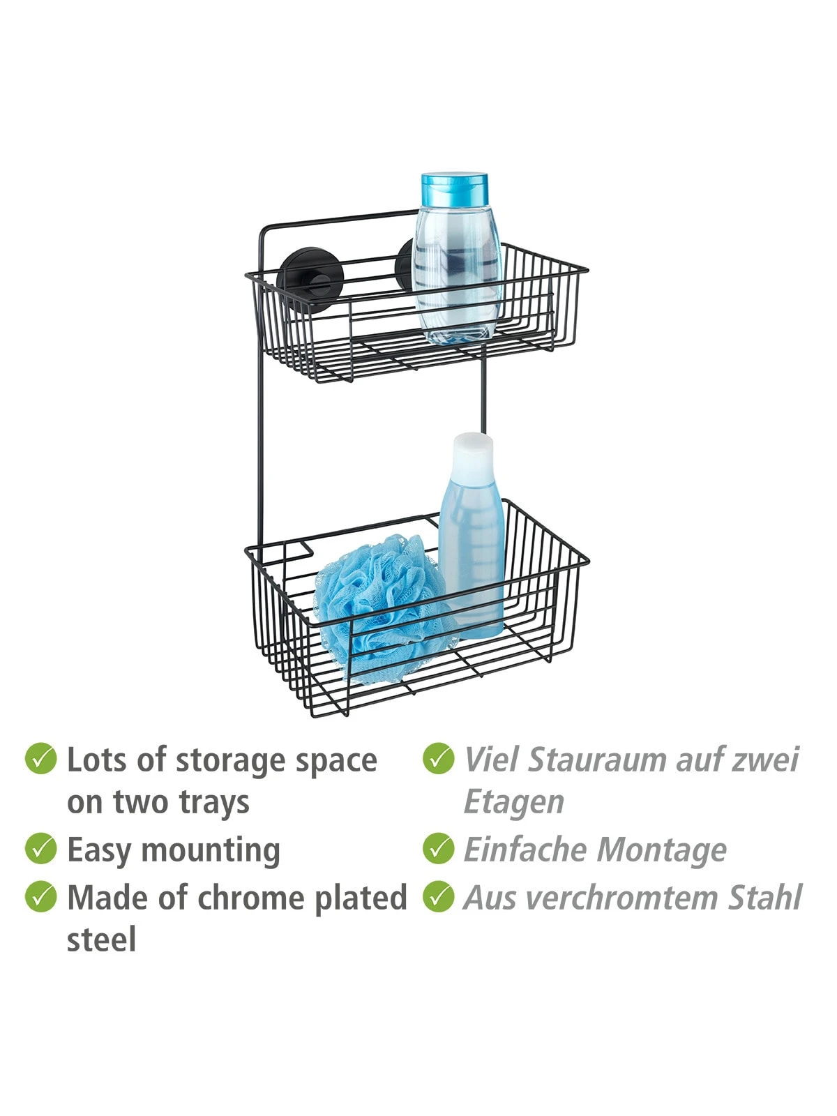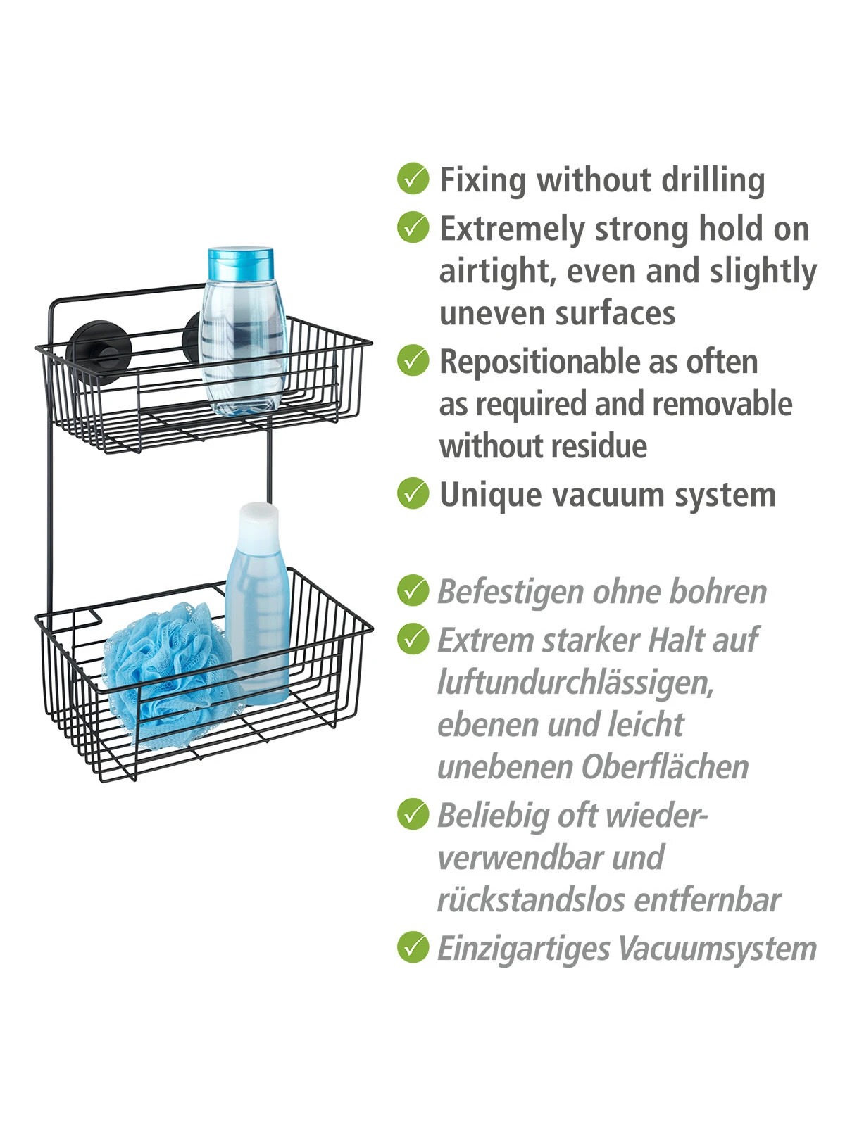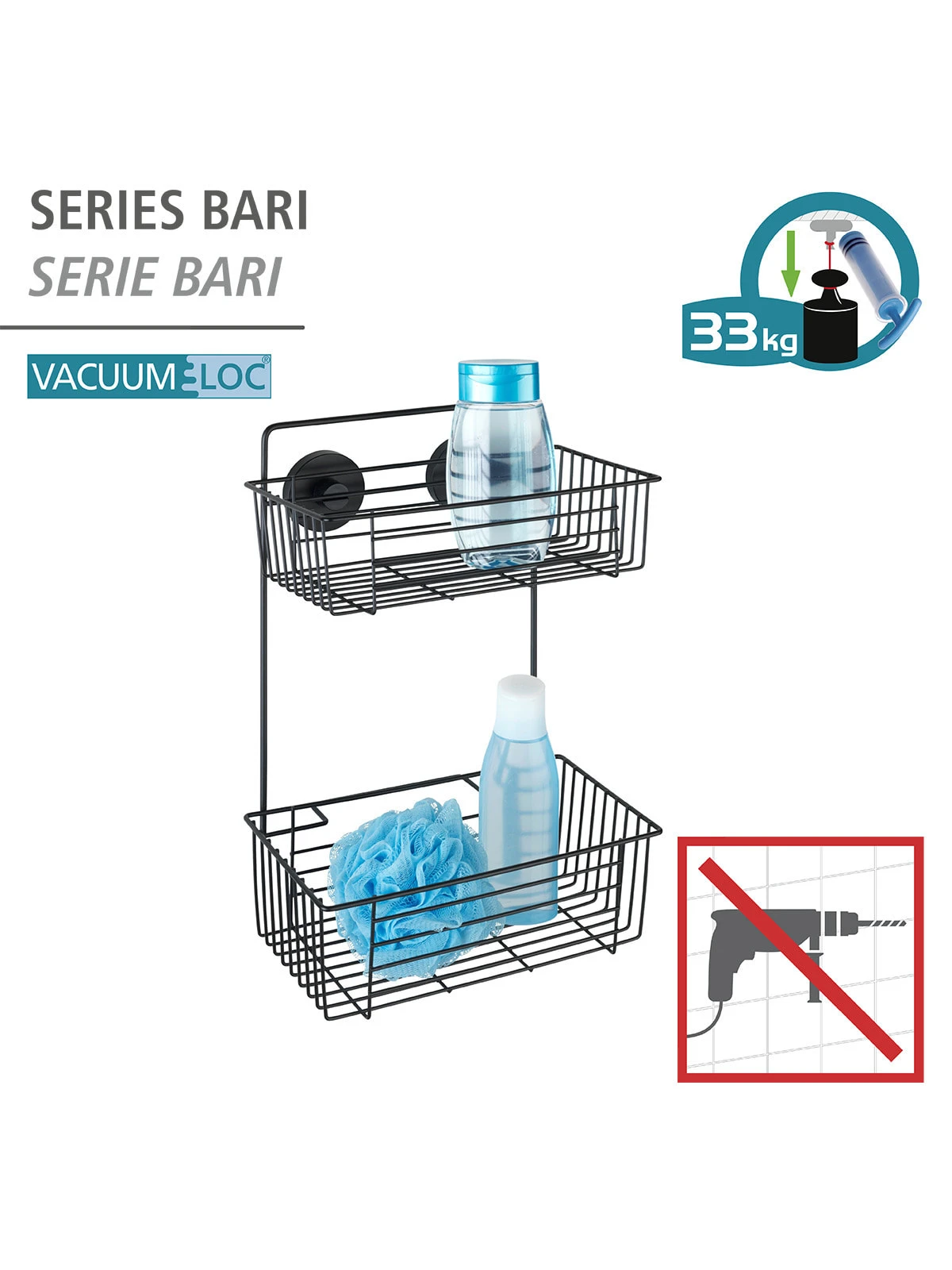 Die trendige Bad-Serie Vacuum-Loc® Bari Schwarz im angesagten Industrial Style verleiht Räumen das gewisse Etwas. Mit ihrem geradlinigen Design und starken Präsenz schaffen die Accessoires den idealen Kontrast zu hellen Bädern. Die Bad-Serie Bari aus schwarz-matt lackiertem Stahl bietet eine große Auswahl an geräumigen Wandablagen, die für zusätzlichen Stauraum im Bad sorgen.