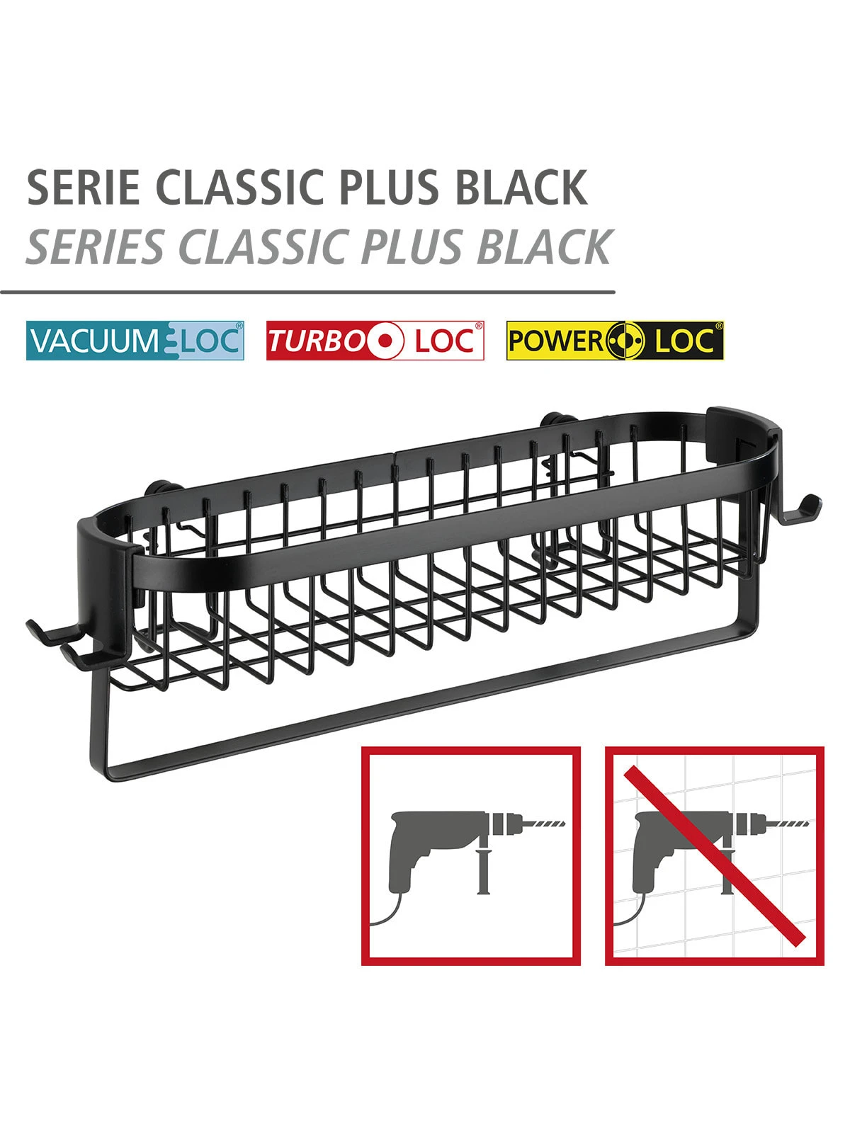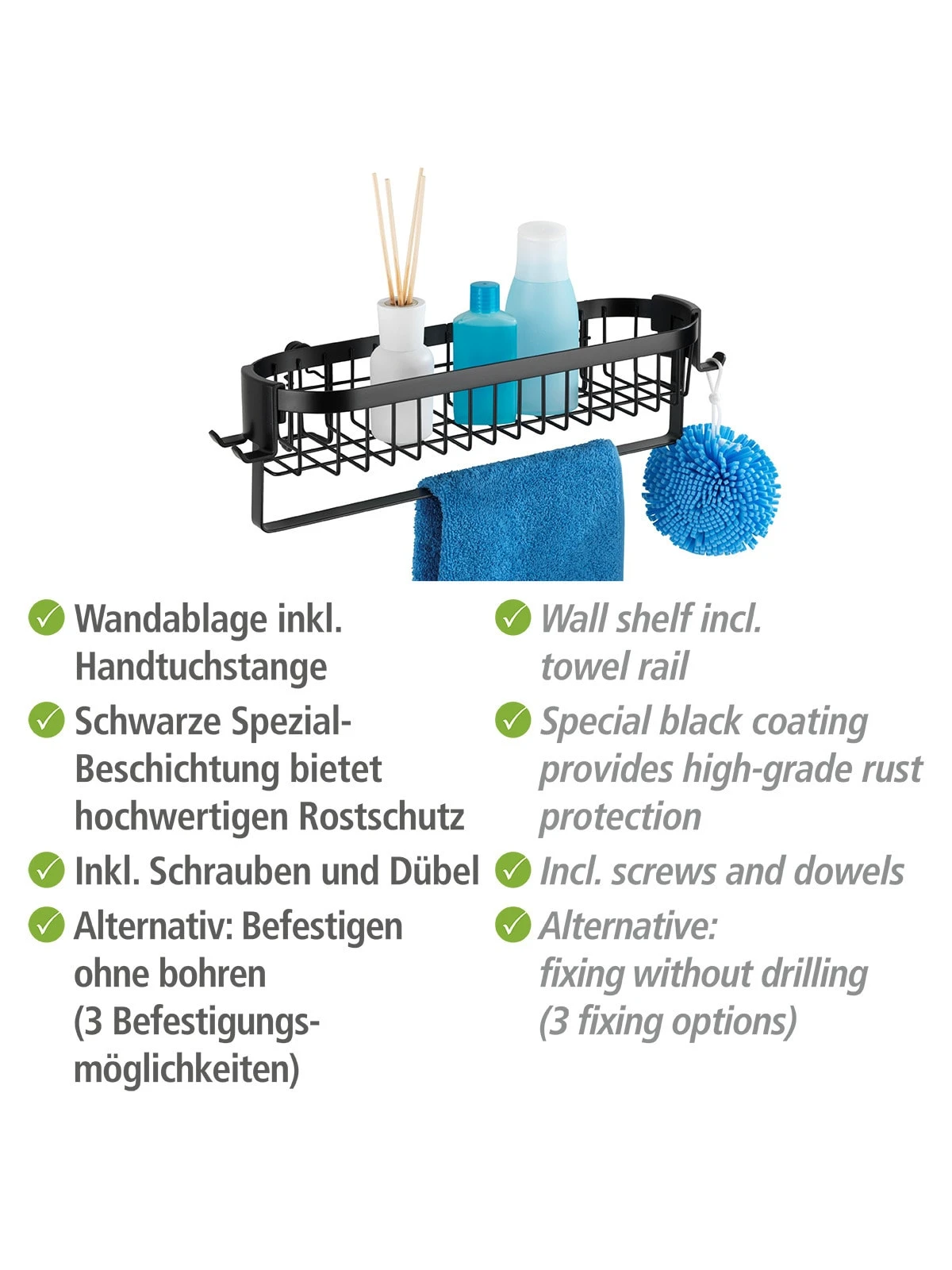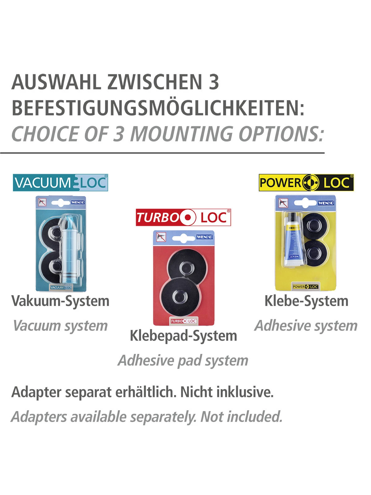 – Auch Befestigung ohne bohren möglich mit WENKO Vacuum-Loc®, Turbo-Loc® & Power-Loc® Adaptern (separat erhältlich)