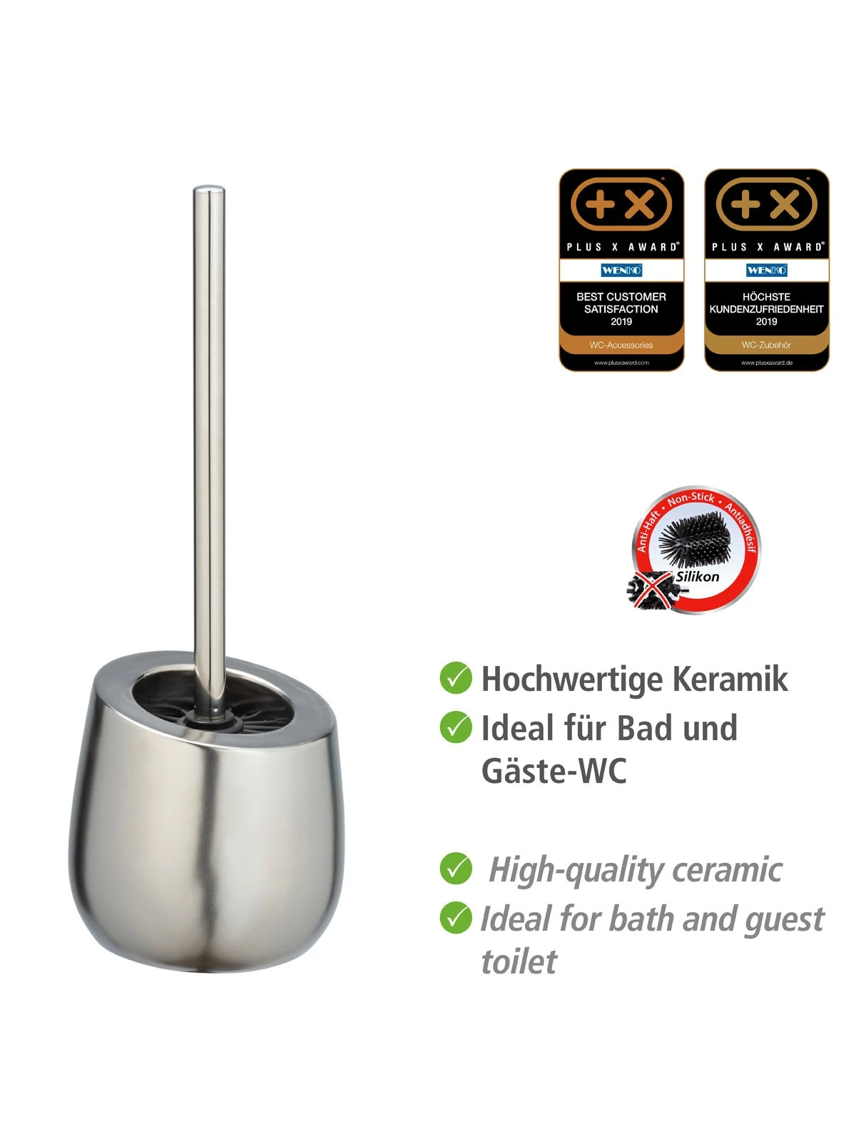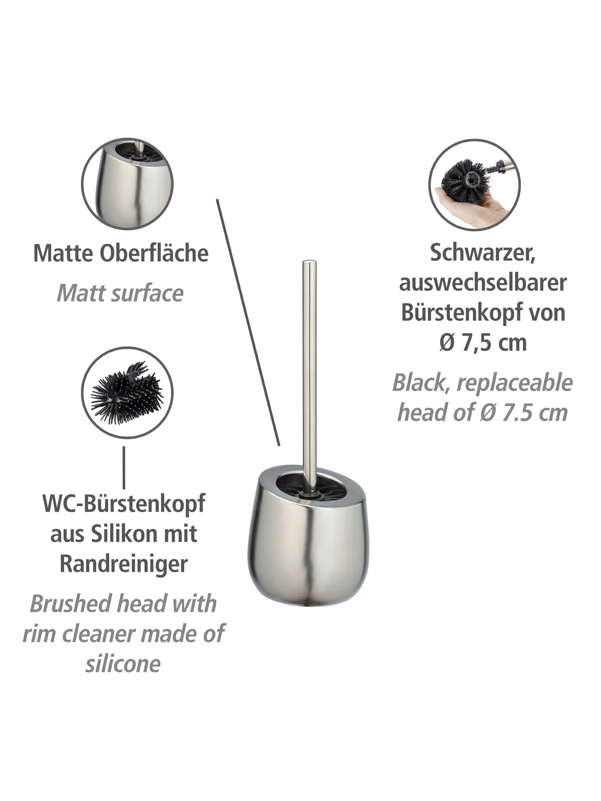 Der hochwertige, schwarze Bürstenkopf von Ø 7,5 cm ist aus Silikon gefertigt und auswechselbar. Seine spezielle Anti-Haft-Wirkung sorgt dafür, dass sich hartnäckige Reste und Toilettenpapier nicht in der Bürste festsetzen, sondern beim Reinigen einfach weggespült werden. So bleibt die clevere Bürste immer hygienisch sauber und reinigt sich selber.