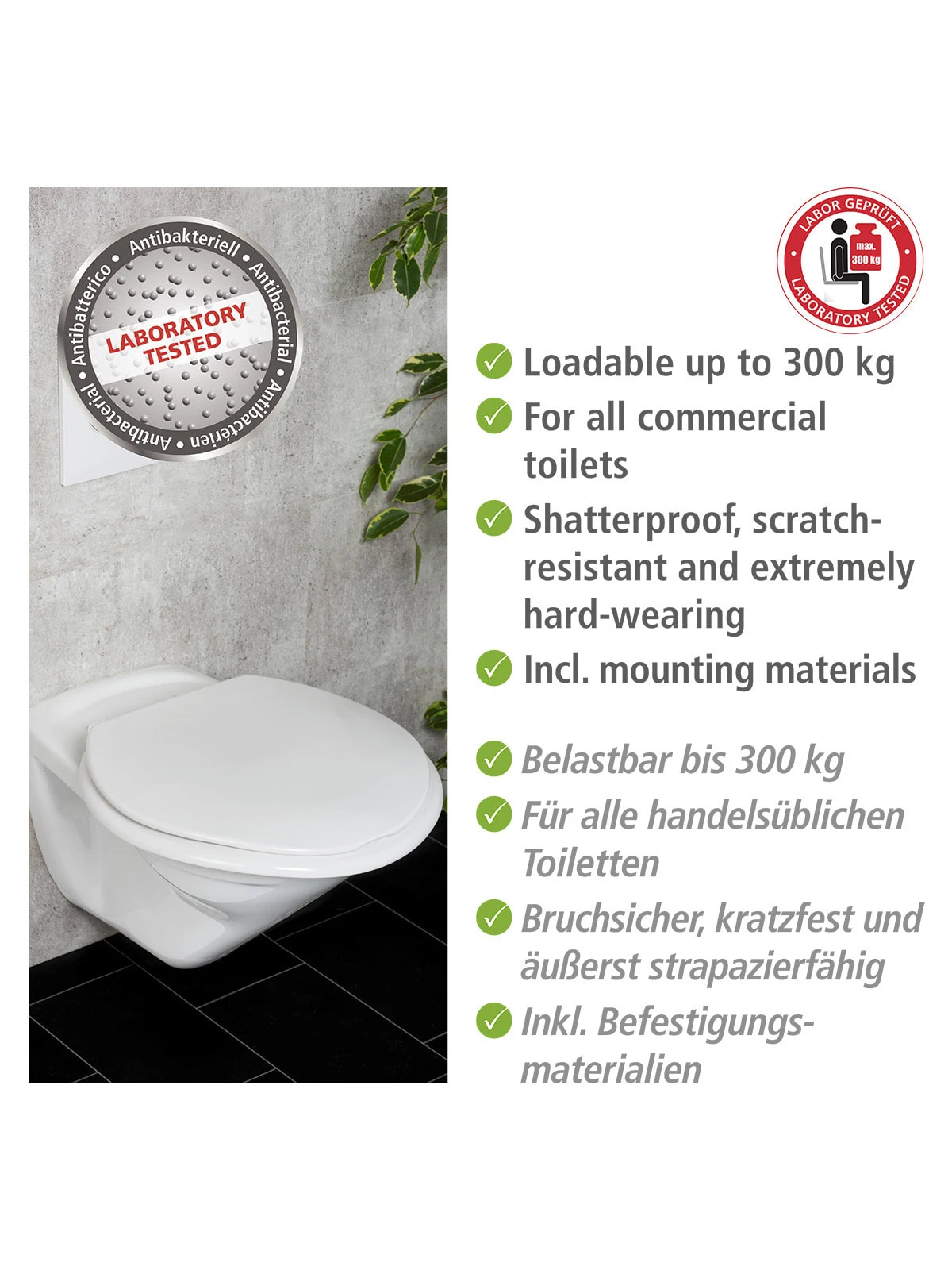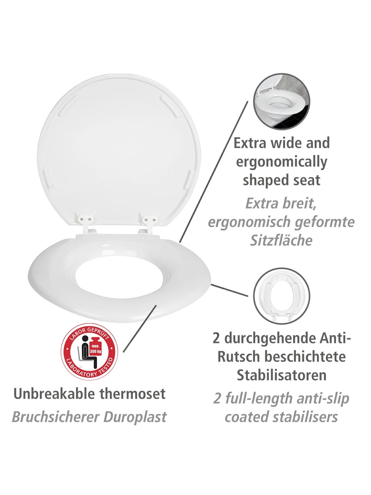 Gefertigt ist der durch ein akkreditiertes Labor hinsichtlich seiner großzügigen Belastungsgrenze geprüfte WC-Sitz aus hochwertigem Duroplast. Das Material zeichnet seine Robustheit aus. Es ist bruchsicher, kratzfest und äußerst strapazierfähig. Angebracht werden kann der WC-Sitz auf allen handelsüblichen Toiletten. WENKO liefert zu dem Toilettensitz alle Befestigungsmaterialien gleich mit.