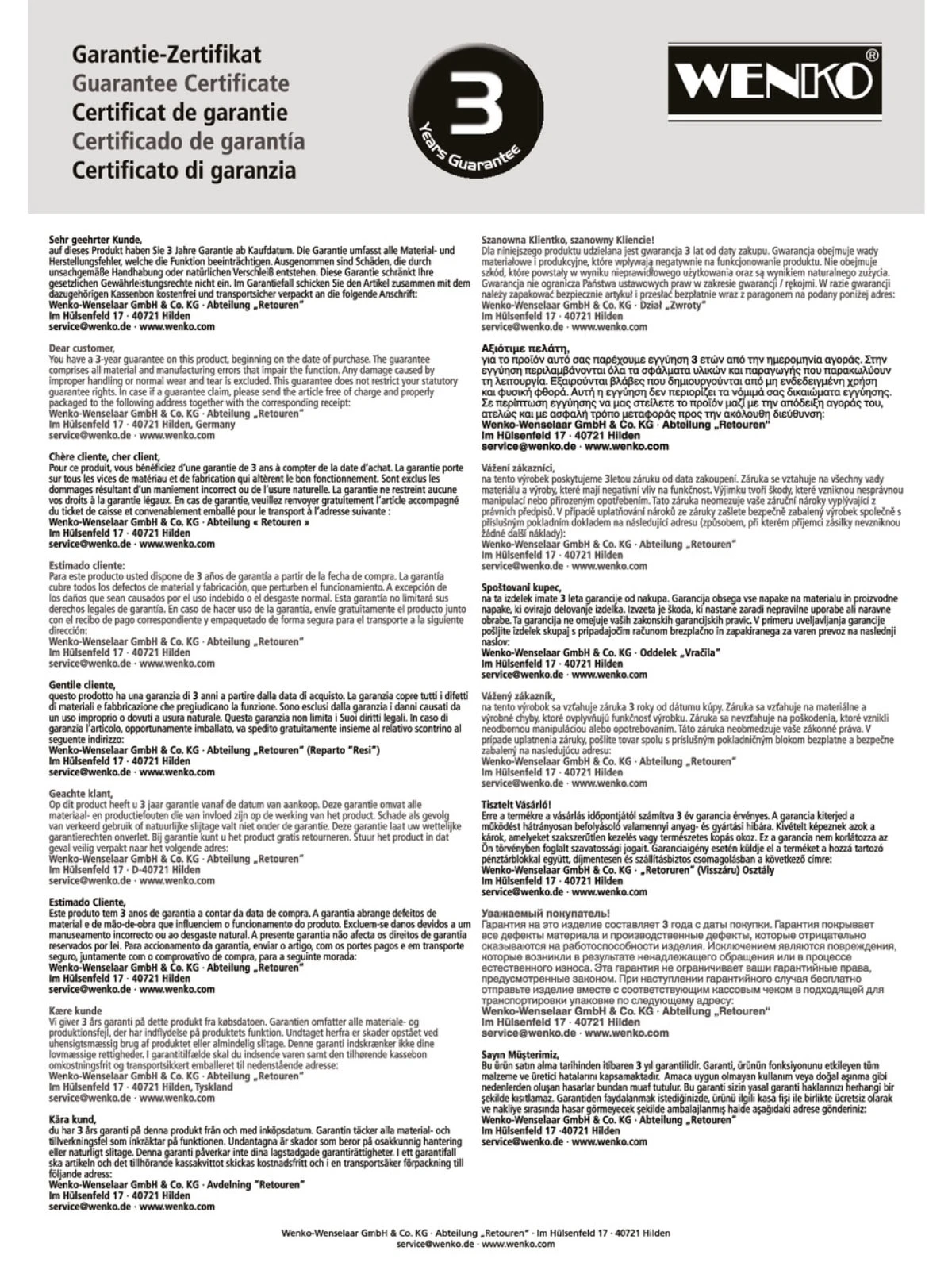Auf dieses Produkt haben Sie 3 Jahre Garantie ab Kaufdatum. Die Garantie umfasst alle Material- und Herstellungsfehler, welche die Funktion beeinträchtigen. Ausgenommen sind Schäden, die durch unsachgemäße Handhabung oder natürlichen Verschleiß entstehen. Diese Garantie schränkt Ihre gesetzlichen Gewährleistungsrechte nicht ein. Im Garantiefall schicken Sie den Artikel zusammen mit dem dazugehörigen Kassenbon kostenfrei und transportsicher verpackt an die folgende Anschrift: Wenko-Wenselaar GmbH & Co. KG · Abteilung „Retouren“ Im Hülsenfeld 17 · 40721 Hilden [email protected]
